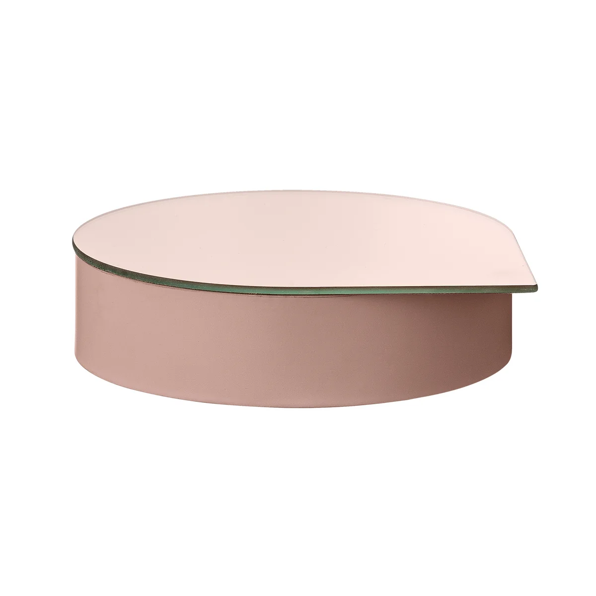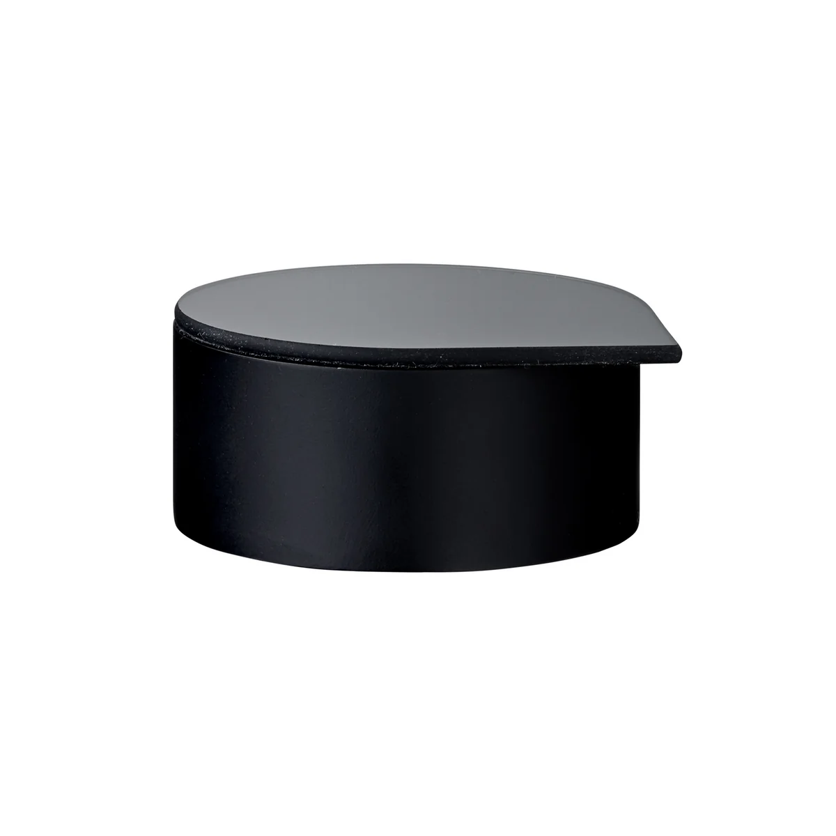 Der Deckel fungiert gleichzeitig als Spiegel und kann ganz einfach in die schmale Lücke zwischen den beiden kleinsten Fächern geschoben werden. Dank seiner Tropfenform hat der Spiegel dort einen sicheren Stand und kann nützlich sein, um Ketten und Ohrringe anzulegen. Auch als Aufbewahrung für Kosmetikartikel lässt sich Gutta hervorragend einsetzen, wobei der Spiegel für die morgendliche Routine eingesetzt werden kann.