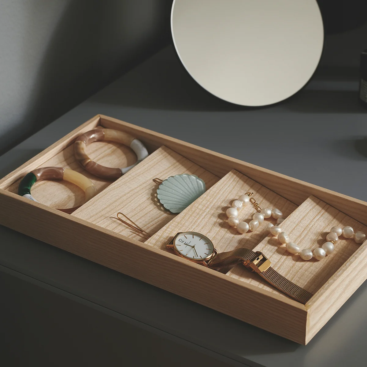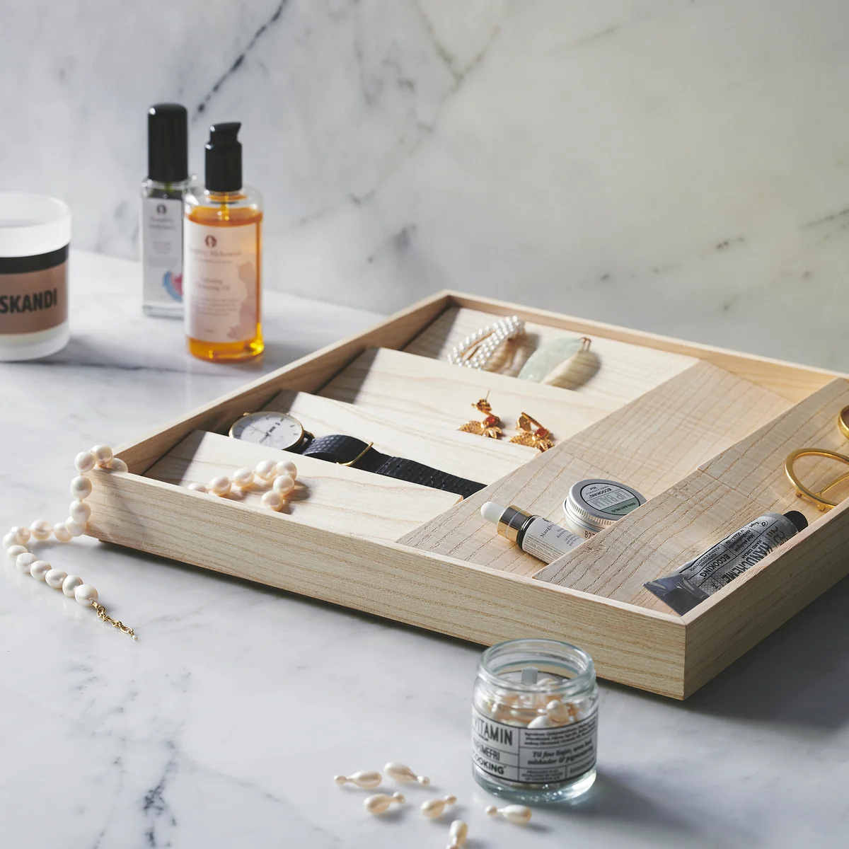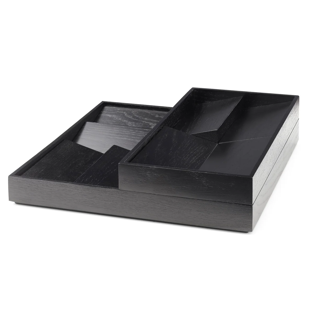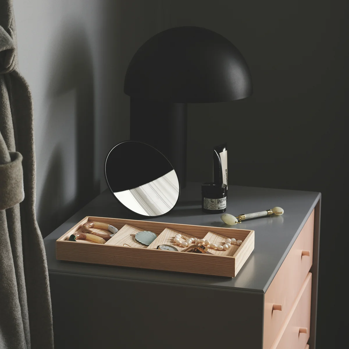 Inspiriert von den Sanddünen in der Landschaft hinter Valencia, wurde der Duune Organizer von Gejst entworfen. Der Organizer besteht aus einem Rahmen aus Eichen- oder Eschenholz, in dem mehrere Holzklötze angeordnet werden. Diese schaffen eine Vielzahl kleiner Ablagen für Schmuck und können individuell arrangiert werden. Der Duune Organizer eignet sich in elegantem Schwarz oder Naturton ideal für die stilvolle Aufbewahrung von Schmuck und Uhren. Der Kasten von Gejst kann auf einer Kommode im Schlafzimmer oder in einem Regal im Badezimmer platziert werden. Alternativ sorgt Duune auch im Büro auf dem Schreibtisch für Ordnung.