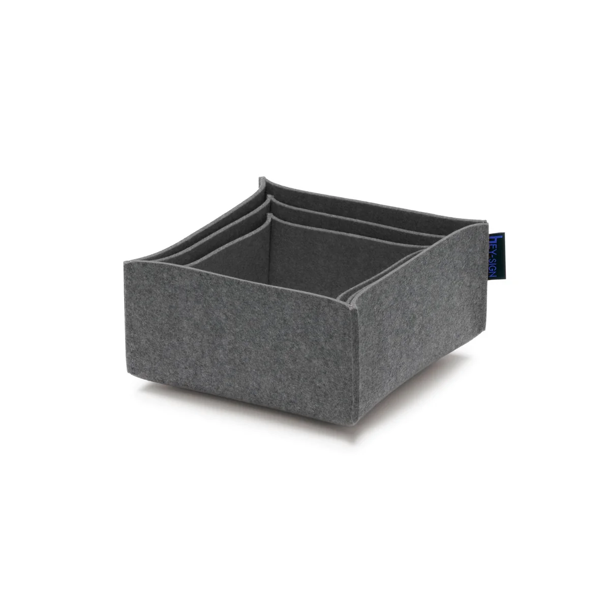 Bei Nichtgebrauch lassen sich die praktischen Filzkörbe einfach ineinander stapeln, so können die Aufbewahrungskörbe bei Bedarf platzsparend verstaut werden. Als dekorativer Blickfang sind die Boxen, wie alle Hey Sign Produkte, in vielen weiteren Farben erhältlich.