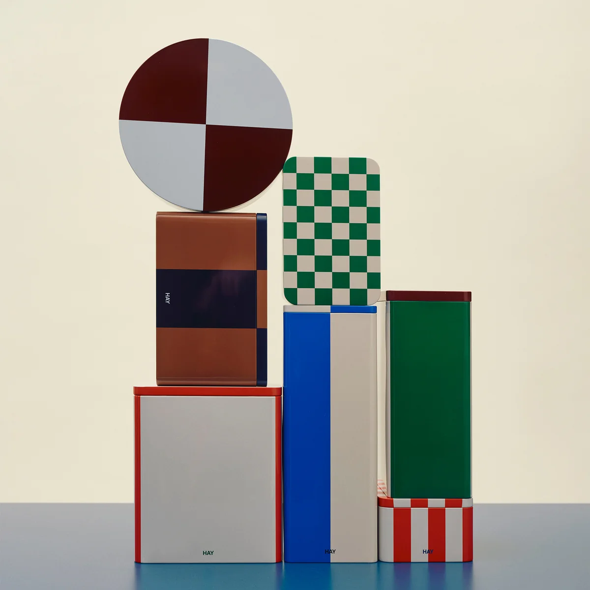 HAY's Tin Container sind sowohl funktionale als auch dekorative Aufbewahrungsboxen, die sich durch ihre bunten Muster und ihre glänzende Oberfläche auszeichnen. Deckel und Behälter gehen nahtlos ineinander über und bieten ein elegantes, nahtloses Aussehen und einen luftdichten Verschluss, wodurch sie sich ideal für die Aufbewahrung trockener Lebensmittel eignen.