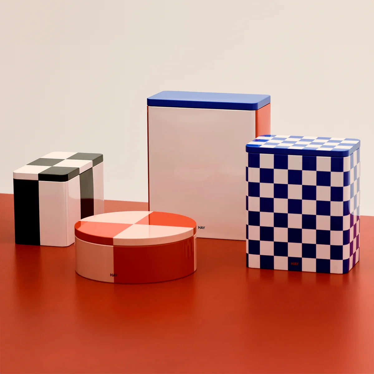 HAY's Tin Container sind sowohl funktionale als auch dekorative Aufbewahrungsboxen, die sich durch ihre bunten Muster und ihre glänzende Oberfläche auszeichnen. Deckel und Behälter gehen nahtlos ineinander über und bieten ein elegantes, nahtloses Aussehen und einen luftdichten Verschluss, wodurch sie sich ideal für die Aufbewahrung trockener Lebensmittel eignen.