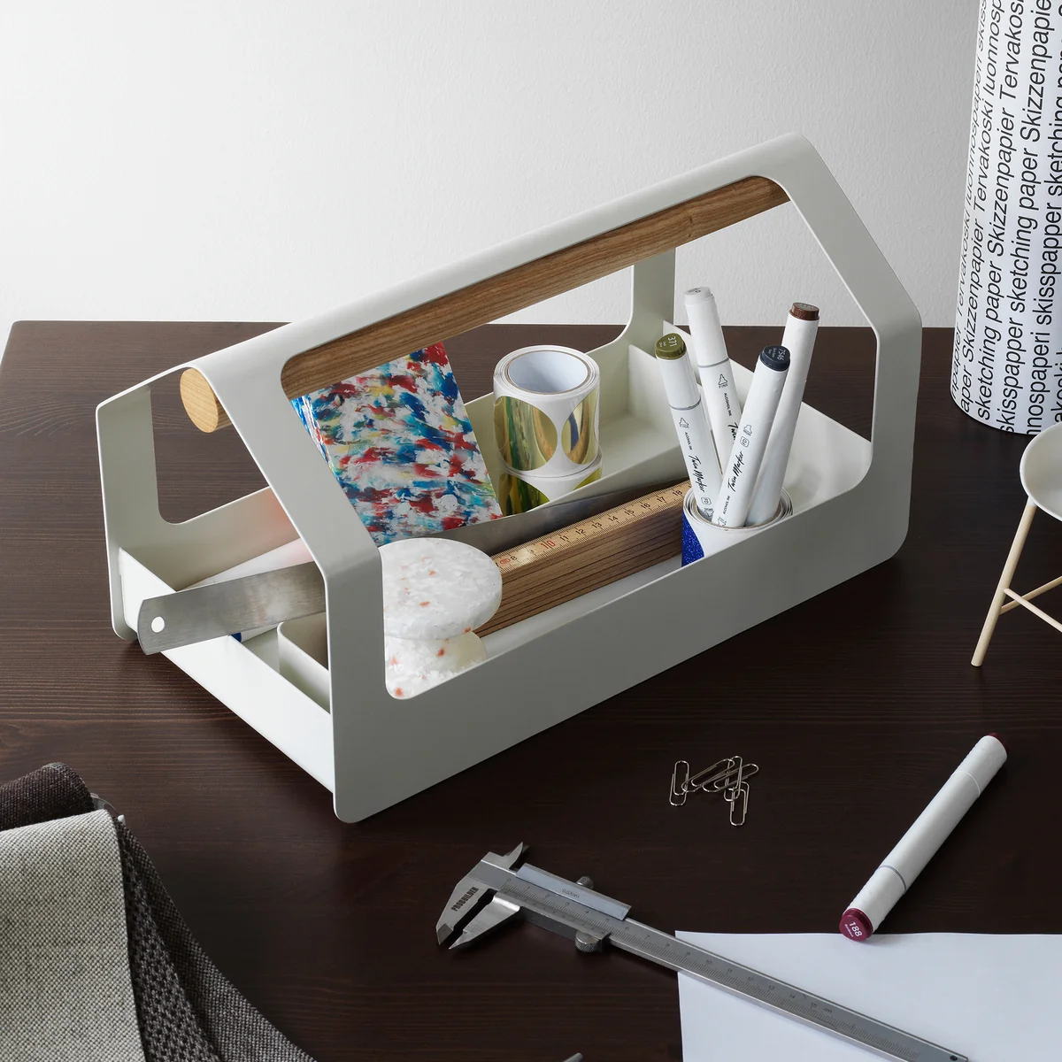 Gefertigt aus pulverbeschichtetem Stahl, überzeugt die Toolbox durch ihre offene, architektonische Struktur, die großzügigen Stauraum ohne feste Unterteilungen bietet. So lassen sich Werkzeuge, Schreibutensilien oder Alltagsgegenstände individuell organisieren. Der glatte Holzgriff setzt einen warmen, haptischen Kontrast zum industriellen Material und sorgt für angenehmen Transport und eine vertraute Anmutung.