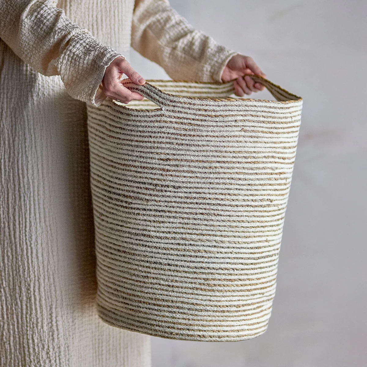 Der Selena Korb vereint Funktionalität mit stilvoller Ästhetik. Gefertigt aus natürlicher Jute, bringt er mit seinem schlichten, gestreiften Design Wärme und Struktur in jeden Wohnraum. Die feinen, horizontalen Streifen in neutralen Tönen verleihen ihm eine zeitlose Optik, die sich harmonisch in verschiedene Einrichtungsstile einfügt. Perfekt zur dekorativen Aufbewahrung von Decken, Zeitschriften oder anderen Alltagsgegenständen im Wohnzimmer, Schlafzimmer oder Eingangsbereich.