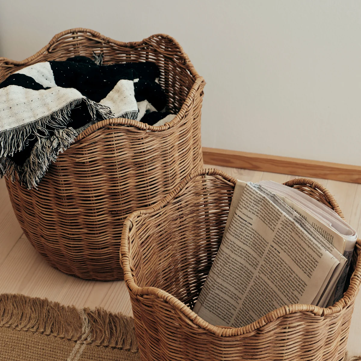 Der Lola Korb von Broste Copenhagen verbindet funktionale Aufbewahrung mit natürlicher Ästhetik. Gefertigt aus Rattan, sorgt die charakteristische Wellenkante für eine charmante und strukturierte Optik. Der Korb eignet sich ideal zur Aufbewahrung von Decken, Zeitschriften oder Spielzeug und bringt gleichzeitig eine warme, zeitlose Note in den Wohnraum.