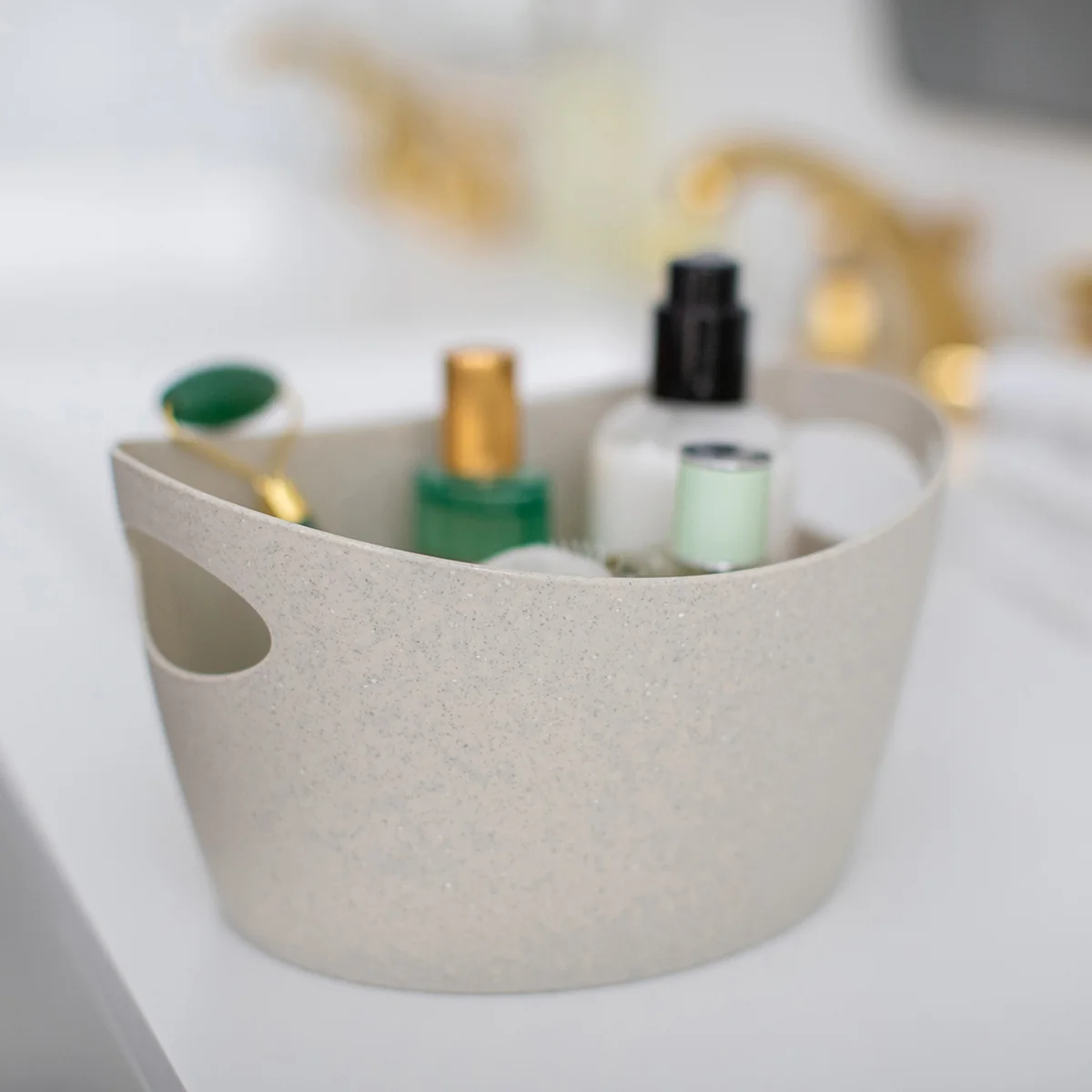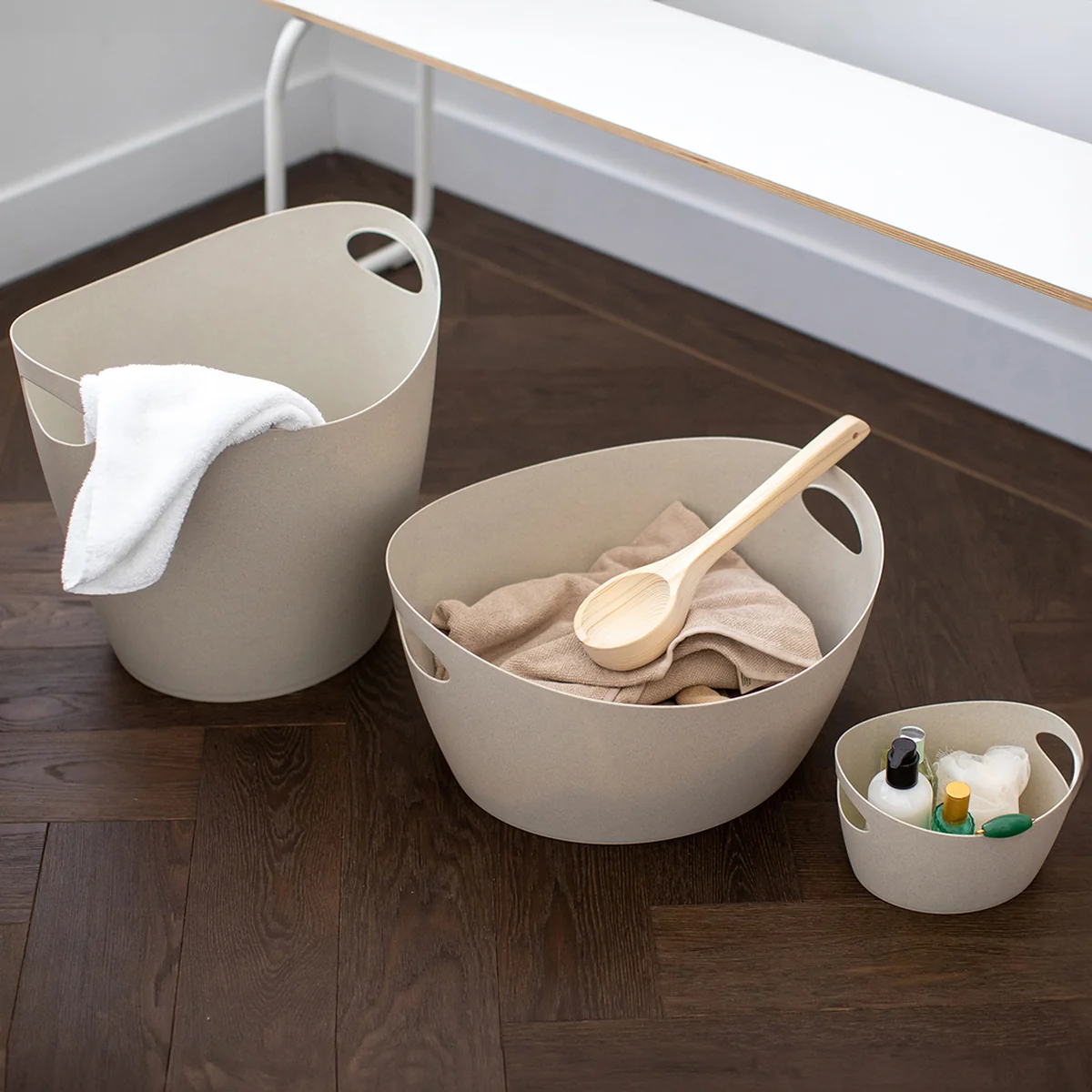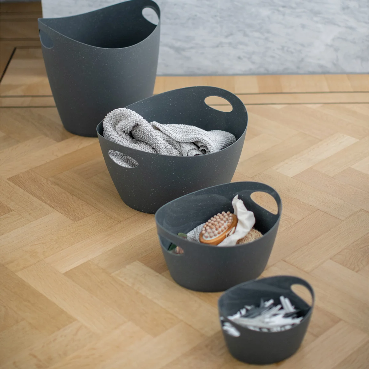 Der Bottichelli Utensilo (Recycled) Aufbewahrungskorb von Koziol begeistert mit seiner simplen Optik und seiner hohen Funktionalität. Greift man den Korb an seinen Griffen, so erhält der Korb einen ovalen Schwung. Je nach Anwendung verändert der Bottichelli Utensilo spielerisch seine Form. Ob im Innen- oder Außenbereich, der Aufbewahrungskorb kann optimal nach Ihren Bedürfnissen eingesetzt werden. Allerlei Kleinigkeiten wie Wäscheklammern, Schmuck oder Wattepads können in den Körben gelagert werden.