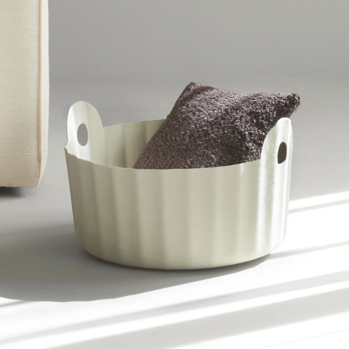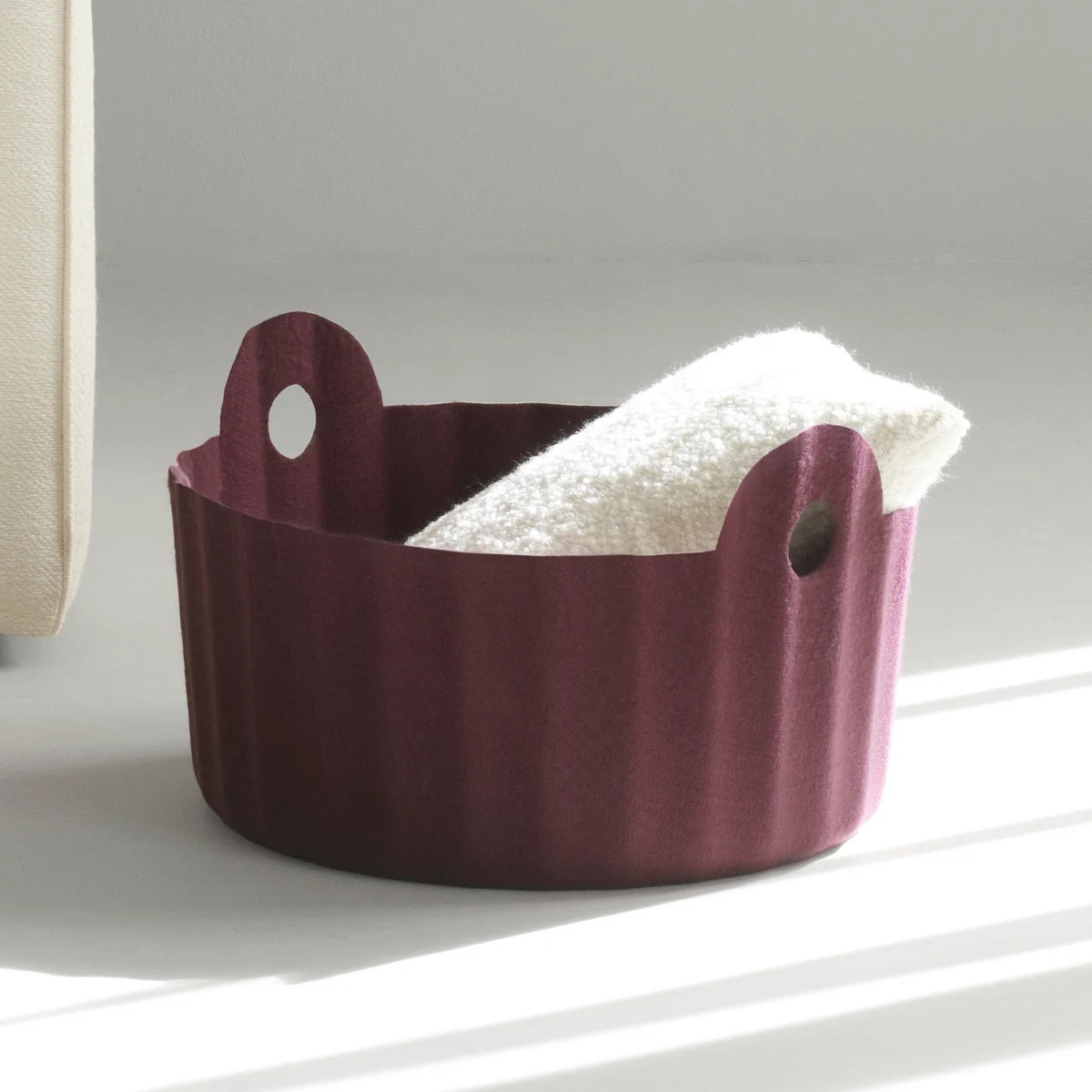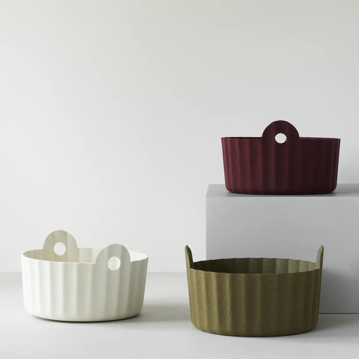 Der Colu Korb von Normann Copenhagen, entworfen von Baptiste Vandaele, vereint zeitgemäße Ästhetik mit verantwortungsbewusster Materialwahl. Gefertigt aus recyceltem PET-Filz – gewonnen aus gebrauchten Plastikflaschen – überzeugt der Korb durch eine weiche Haptik und zugleich robuste Alltagstauglichkeit.
