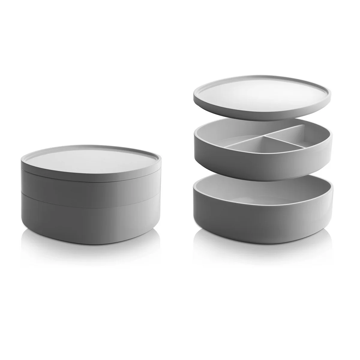 Der Bad-Behälter von Designer Piero Lissoni verleiht dem schlichten Alltagsgegenstand eine ungeahnte Eleganz. In der dreiteiligen Birillo-Box finden viele kleine Gegenstände Platz - von Zopfgummis und Haarspangen über Wimpernzange bis hin zum Schminkzeug. Der untere Behälter fasst größere Utensilien, während der obere in drei Teile gegliedert ist. So ist für fast jedes Utensil im Badezimmer der richtige Platz vorhanden.