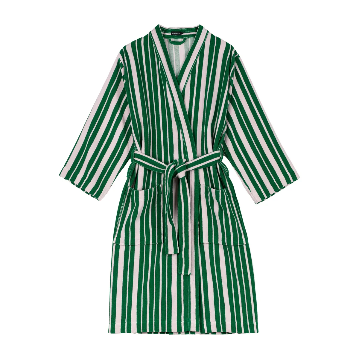 Der Raide Bademantel von Marimekko vereint stilvolles Design mit angenehmem Komfort. Mit seinem ikonischen Streifendesign bringt er skandinavische Eleganz in Ihre Wohlfühlmomente. Gefertigt aus weichem Baumwollfrottee, bietet der Bademantel ein luxuriöses Tragegefühl und hervorragende Saugfähigkeit – perfekt nach dem Duschen oder für entspannte Stunden zu Hause.
