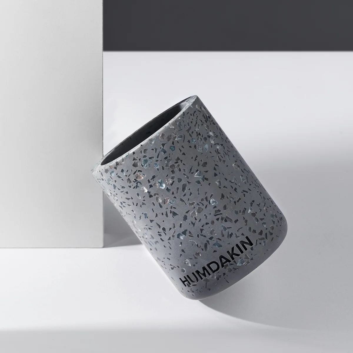 Der Terrazzo Zahnbürstenhalter von Humdakin ist ein wunderschöner, becherähnlicher Artikel aus dem Material Terrazzo. Das Material ist eigentlich eher für Fußböden aus den 70er Jahren bekannt, doch verleiht es vor allem Einrichtungsgegenständen im Badezimmer einen natürlichen und robusten Charme. Der Zahnbürstenhalter ist etwa 10 cm hoch, an der Vorderseite ist der Markenname "Humdakin" hochwertig eingraviert.