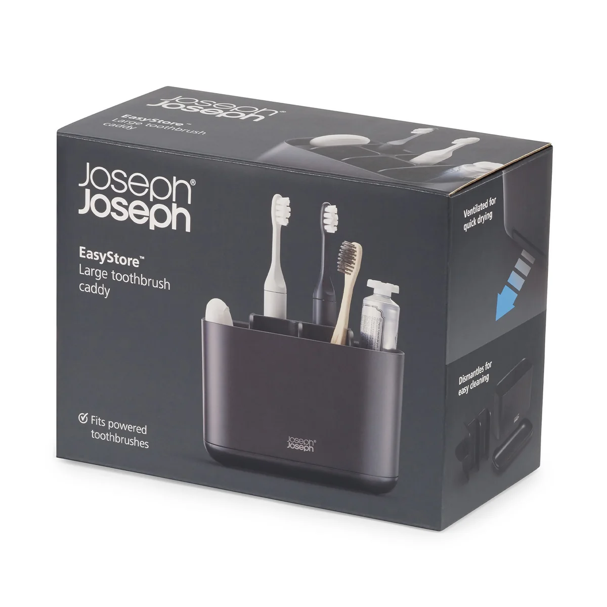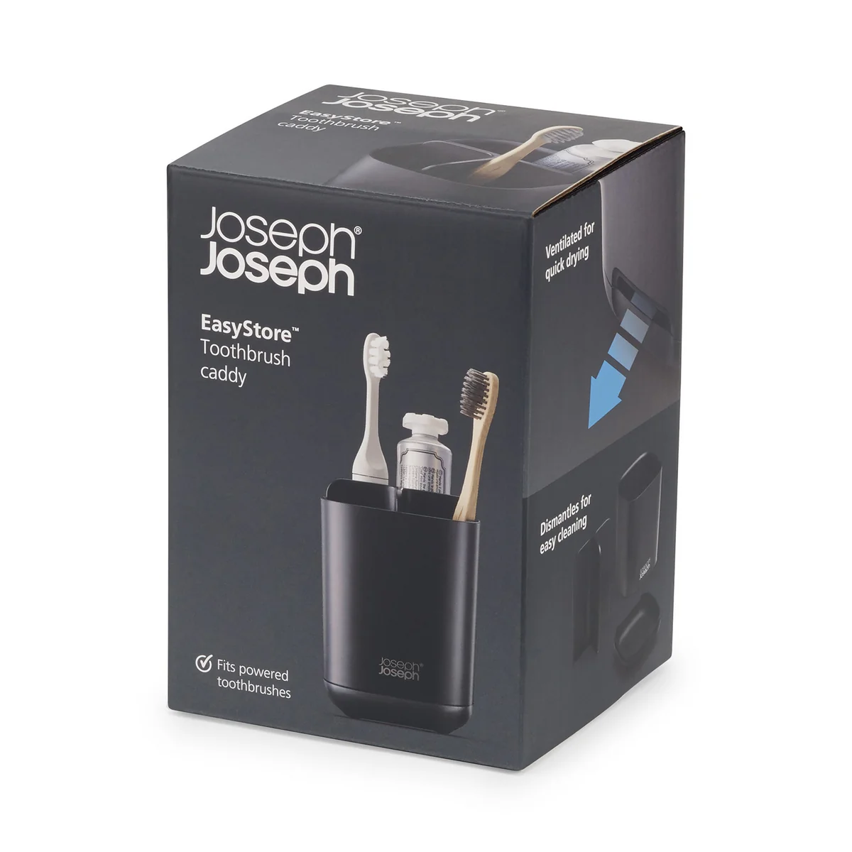 Der EasyStore Zahnbürstenhalter von Joseph Joseph ist eine tolle Ergänzung für das Badezimmer und bietet Platz für Zahnpflegeprodukte wie Zahnbürste, Zahnpasta oder Zahnseide. Dank verschiedener Fächer kann der Behälter einfach unter Familienmitgliedern oder WG-Bewohnern aufgeteilt werden, sodass jeder seinen eigenen Bereich erhält.