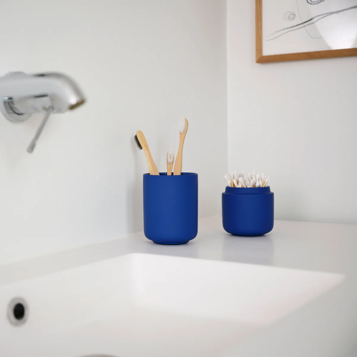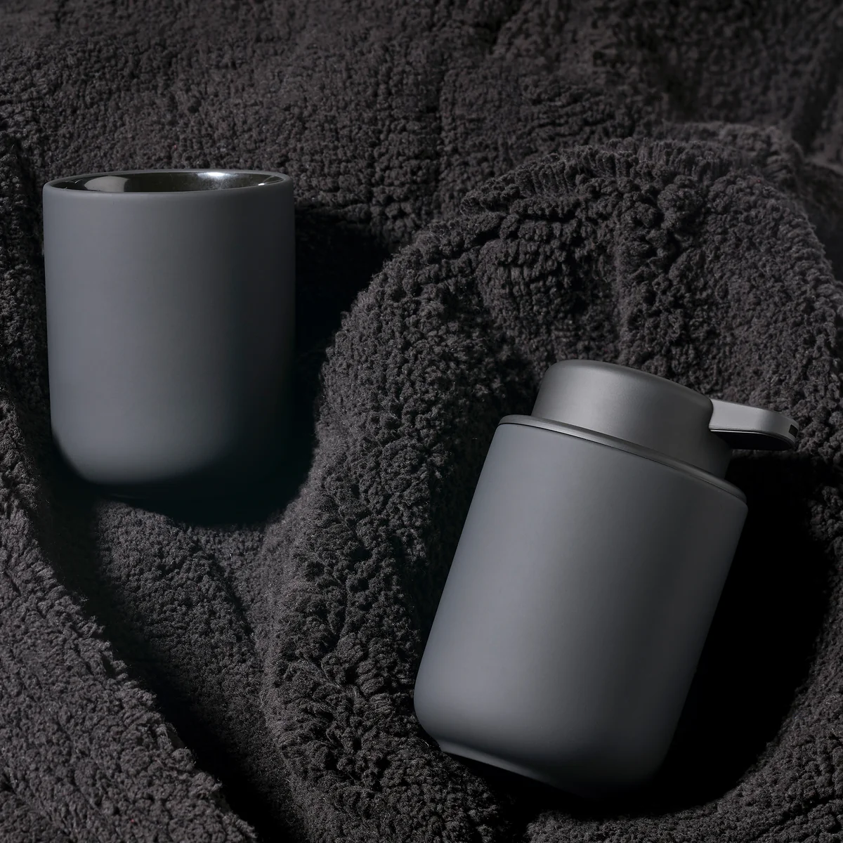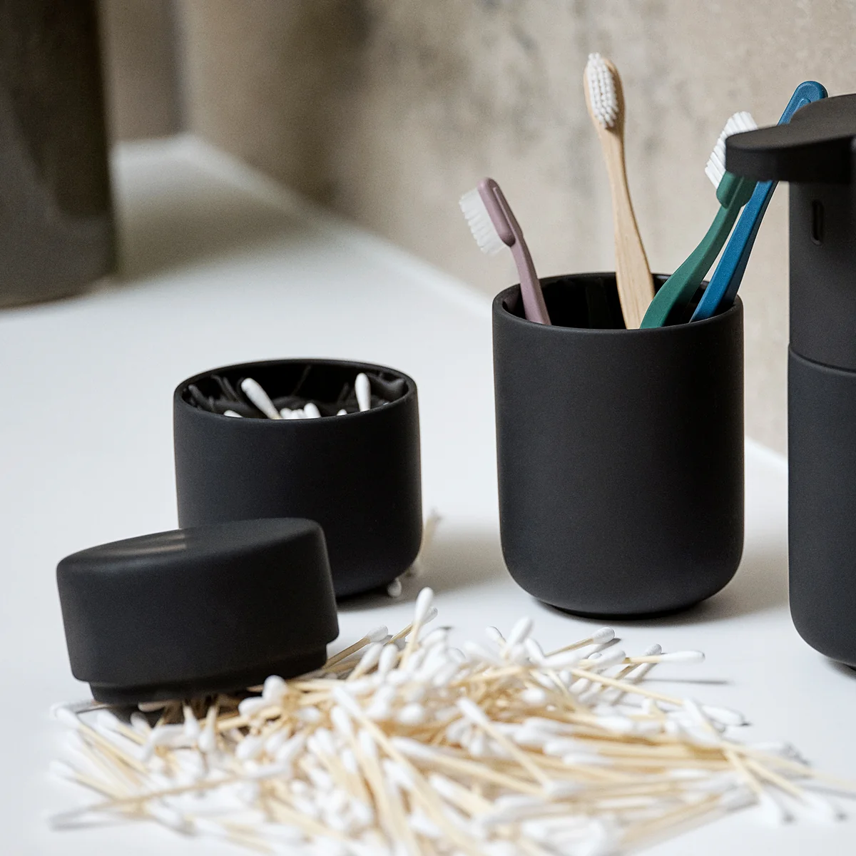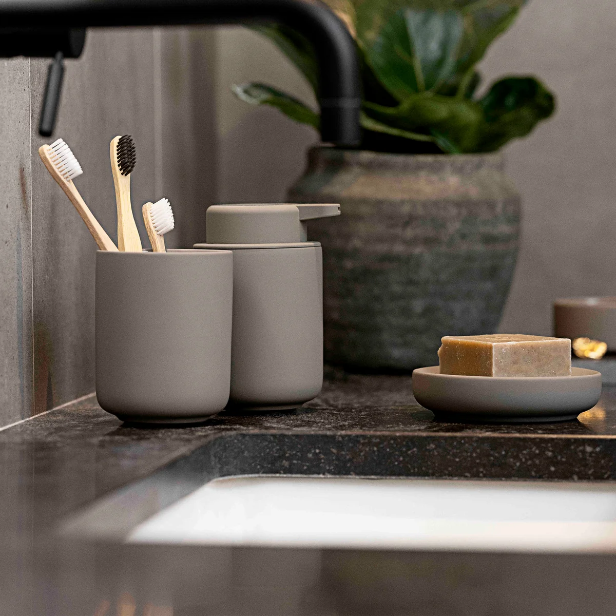 Der Ume Zahnputzbecher ist Teil der gleichnamigen Serie von Zone Denmark, die aus hochwertigen Badezimmer-Accessoires besteht. Wie alle Produkte der Serie zeichnet sich auch der Zahnputzbecher durch sein minimalistisches Design, sanfte Konturen und ein besonderes Finish aus. Gefertigt ist der Becher aus robustem Steingut, das anschließend mit einer samtig-weichen Soft-Touch Beschichtung versehen wurde. Sie sorgt nicht nur für ein edles Erscheinungsbild, sondern auch für eine angenehme Haptik.