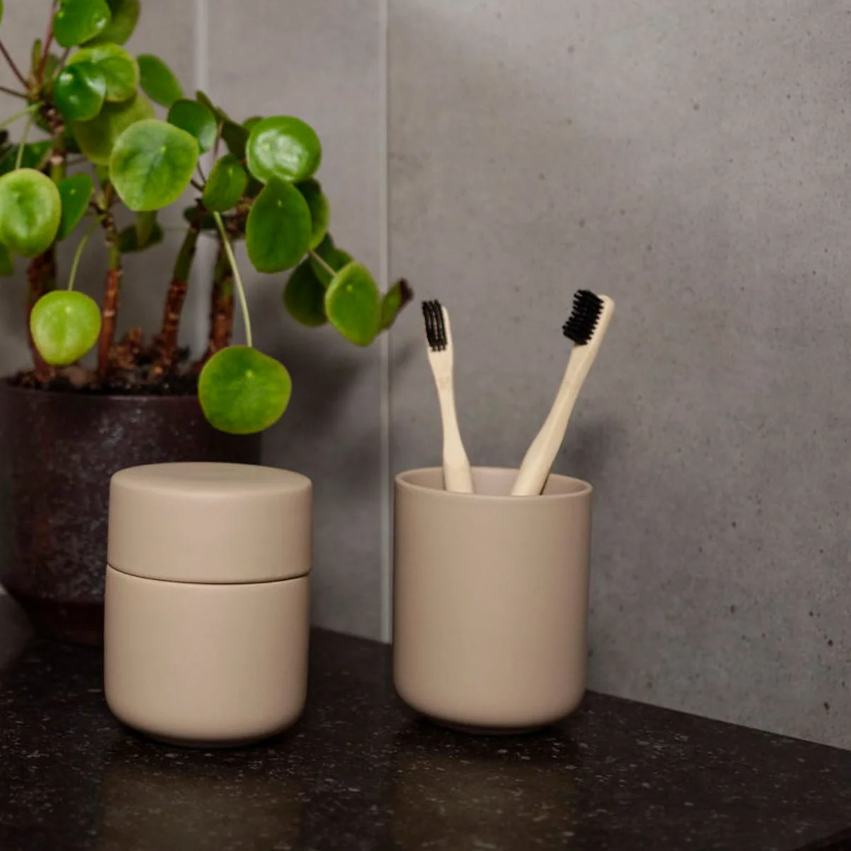 Der Ume Zahnputzbecher ist Teil der gleichnamigen Serie von Zone Denmark, die aus hochwertigen Badezimmer-Accessoires besteht. Wie alle Produkte der Serie zeichnet sich auch der Zahnputzbecher durch sein minimalistisches Design, sanfte Konturen und ein besonderes Finish aus. Gefertigt ist der Becher aus robustem Steingut, das anschließend mit einer samtig-weichen Soft-Touch Beschichtung versehen wurde. Sie sorgt nicht nur für ein edles Erscheinungsbild, sondern auch für eine angenehme Haptik.
