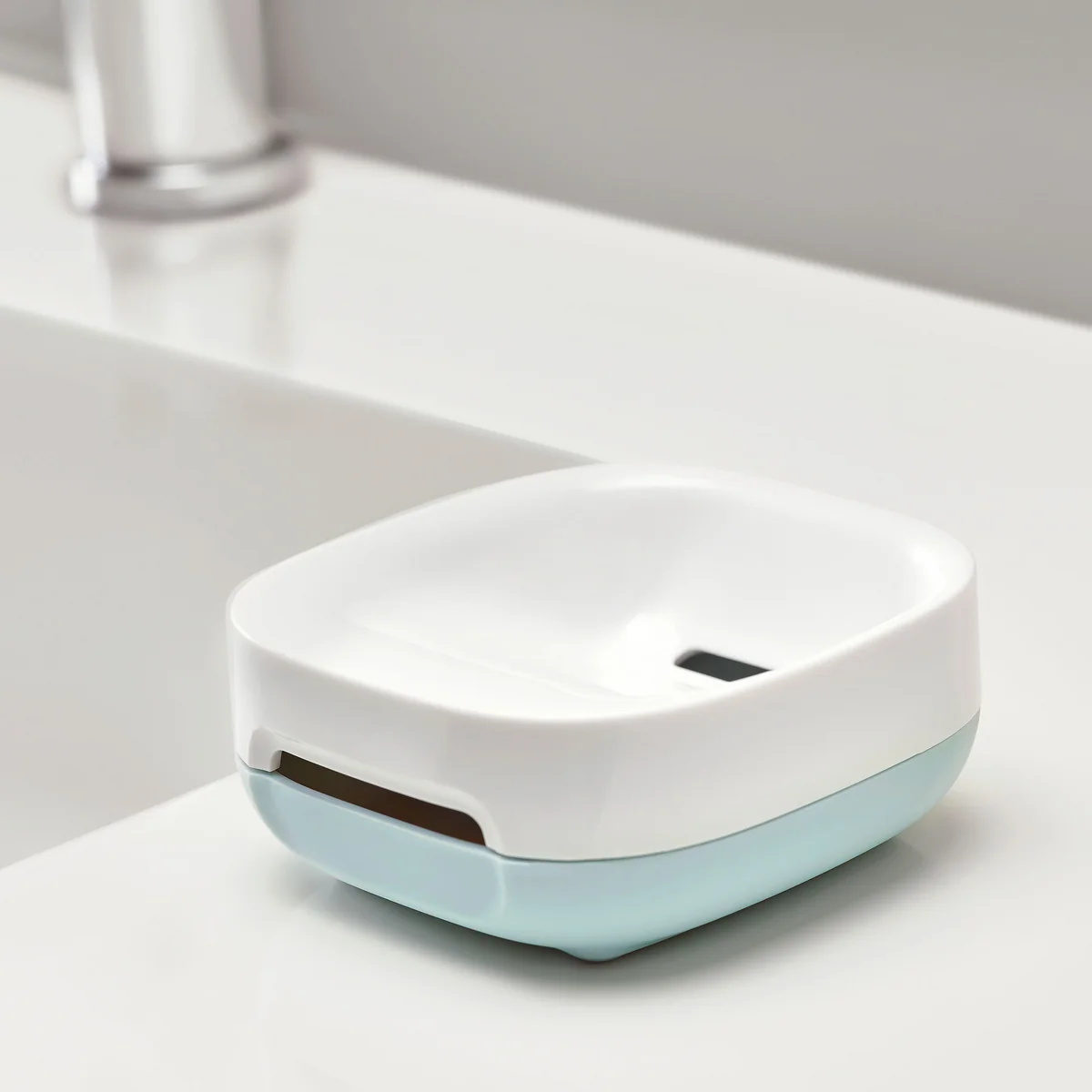 Die Slim Seifenschale von Joseph Joseph begeistert durch ihr innovatives und simples Design, das sich vor allem für Badezimmer mit kleinem Waschbereich eignet. Die geringen Außenmaße der Schale werden durch die abgewinkelte Basis kompensiert, sodass auch ein großes Stück Seife schräg liegend in der Schale Platz findet. Das abtropfende Wasser wird in dem Auffangschälchen gesammelt. Ein Loch auf der Rückseite sorgt für eine ausreichende Belüftung und ermöglicht ein schnelles Trocknen der Flüssigkeiten.