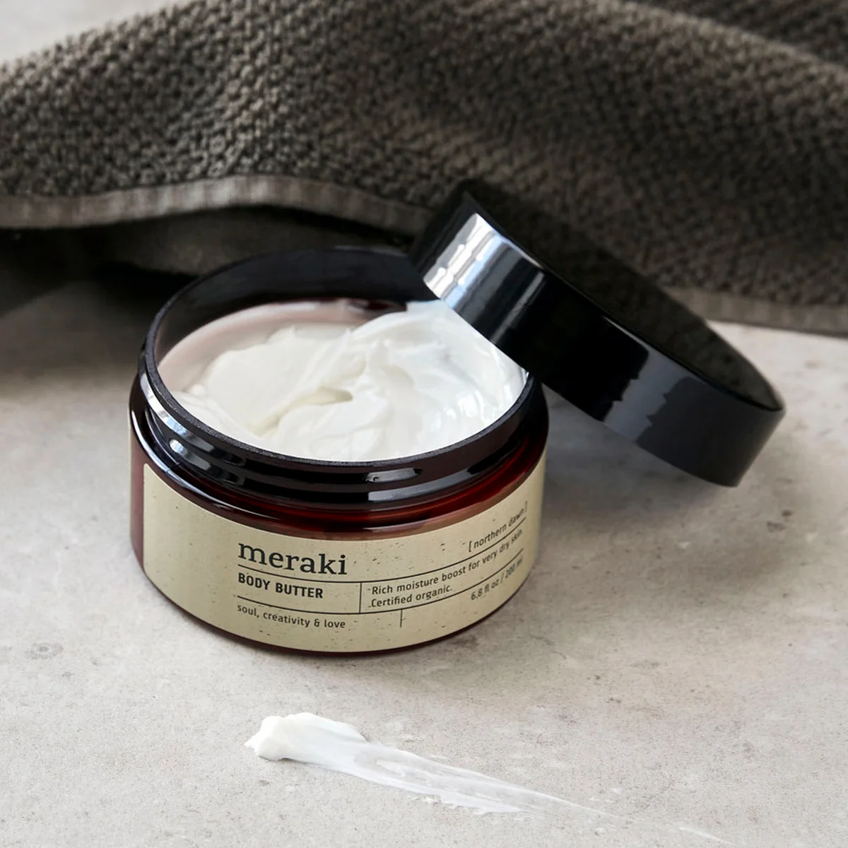 Diese zertifizierte Bio-Körperbutter von Meraki, erhältlich in verschiedenen Ausführungen, versorgt die Haut intensiv mit Feuchtigkeit, ohne dabei schmierig zu wirken. Trockene Haut wird durch eine Kombination aus Aloe Vera, Sheabutter und nährenden Ölen aus Olive, Sonnenblume und Mandel gepflegt und vor dem Austrocknen geschützt. Das Ergebnis ist eine weiche, geschmeidige und tiefgehend gepflegte Haut. Jede Ausführung schützt die Haut vor dem Austrockenen.