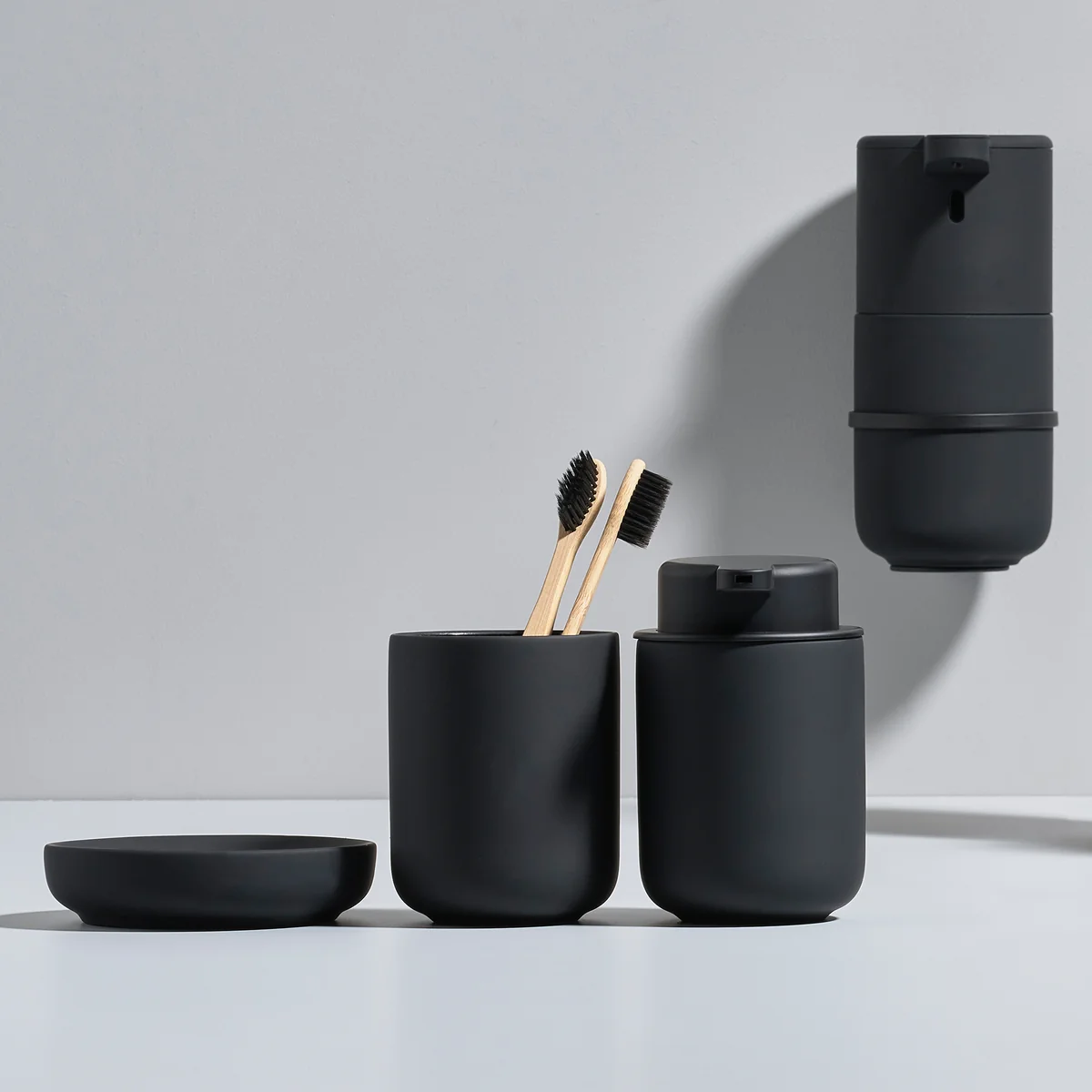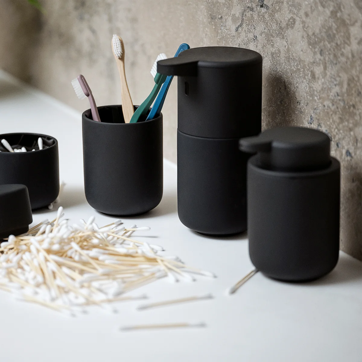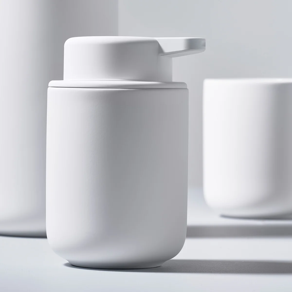 Der Ume Seifenspender von Zone Denmark ist - wie alle Produkte der Ume Serie - ein Entwurf des Designer-Trios VE2, das sich bei seiner Arbeit auf ein harmonisches Zusammenspiel von Optik, Haptik und Funktionalität konzentriert hat. Ume ist das japanische Wort für Pflaumenbaum und steht für Eleganz, Geduld und Stärke. Elegant gestaltet ist auch der Seifenspender mit seinen zarten Konturen und dem besonderen Finish. Der Körper aus Steingut wurde anschließend mit einer samtig-weichen Soft-Touch Beschichtung verstehen, die für eine angenehme Haptik sowie eine edle Erscheinung sorgt.