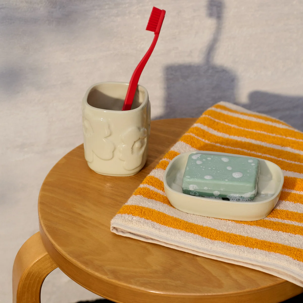 Dieses stilvolle Bad-Accessoire-Set von Marimekko umfasst einen Behälter und eine Seifenschale, beide mit dem geprägten Unikko-Muster versehen – dem legendären Blumenmotiv von Maija Isola. Gefertigt aus Steinzeug und glasiert in einem leuchtenden Blauton, bringt das Set frische Farbimpulse ins Badezimmer. Die spezielle Glasur sorgt für lebendige Farbnuancen und macht jedes Stück zu einem Unikat.