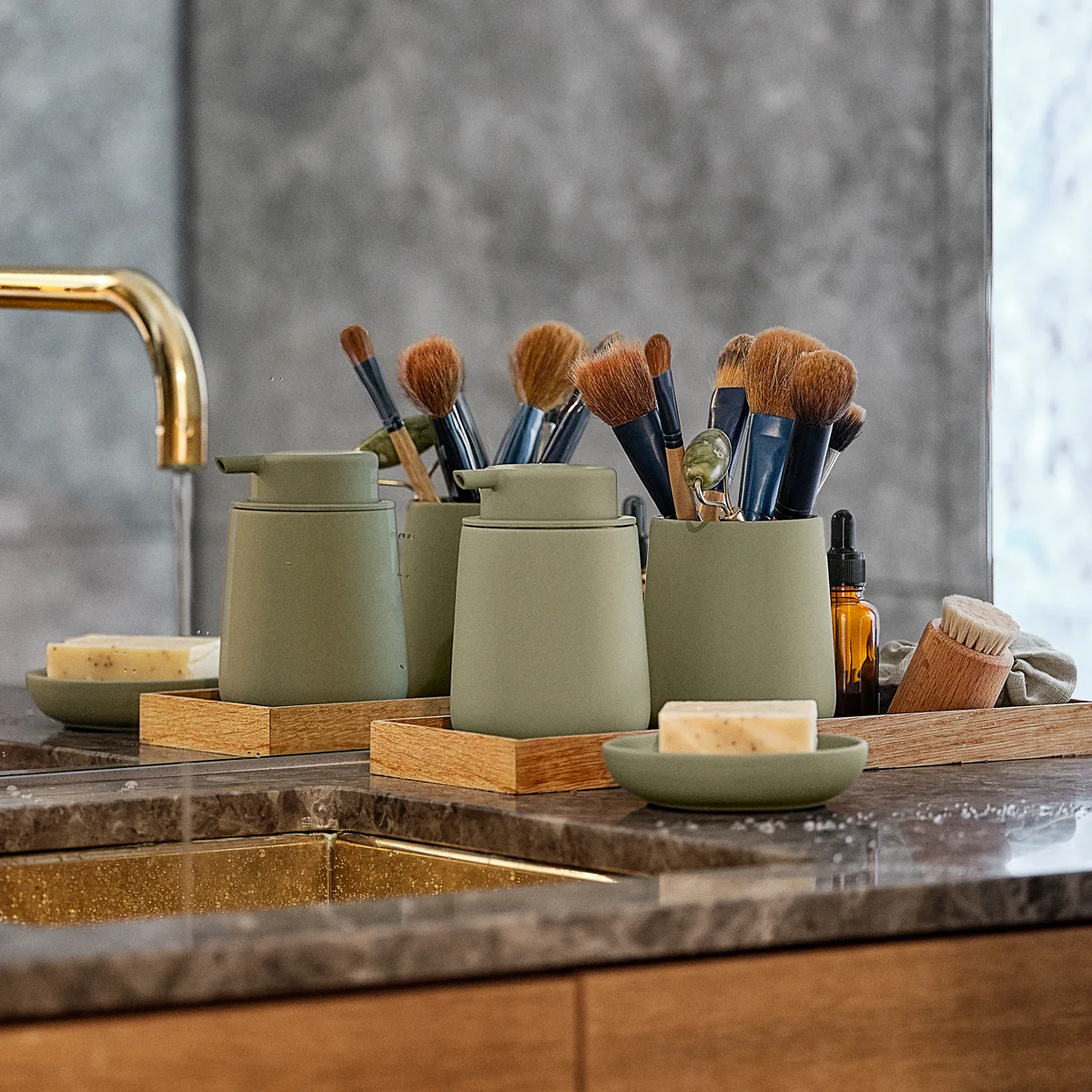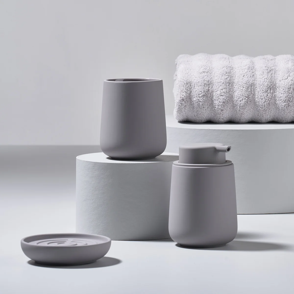 Der Seifenspender, die Toilettenbürste und der Zahnputzbecher sind in der Nova One Serie aus Steinzeug erhältlich. Zu der Nova Kollektion gehören Seifenspender, Toilettenbürsten, Zahnputzbecher und Seifenschalen aus Porzellan und ein Treteimer aus ABS mit Soft Touch Beschichtung , die auf Anfrage auch in weiteren Farben erhältlich sind.