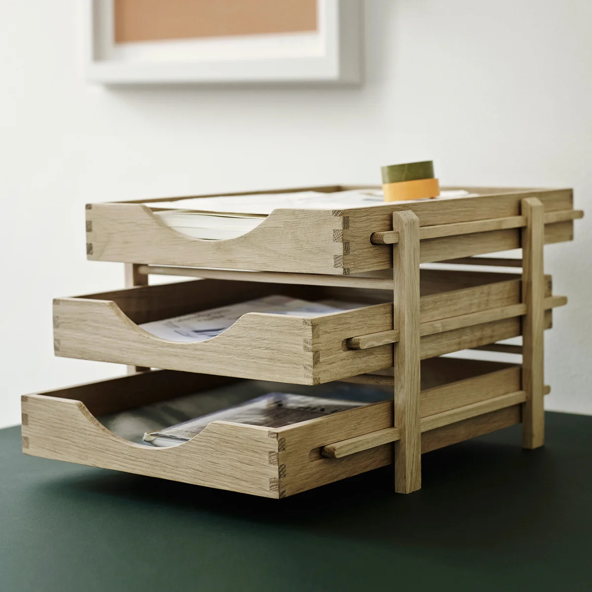 Die Dania Briefablage wird von Skagerak aus massivem Eichenholz gefertigt. Die einzelnen Schubladen lassen sich herausziehen, um einen besseren Zugang zu den Dokumenten in der Ablagebox zu ermöglichen. Mit diesen klassischen, aber zentralen Eigenschaften hebt sich der Letter Tray von anderen Organizern aus Holz deutlich ab.