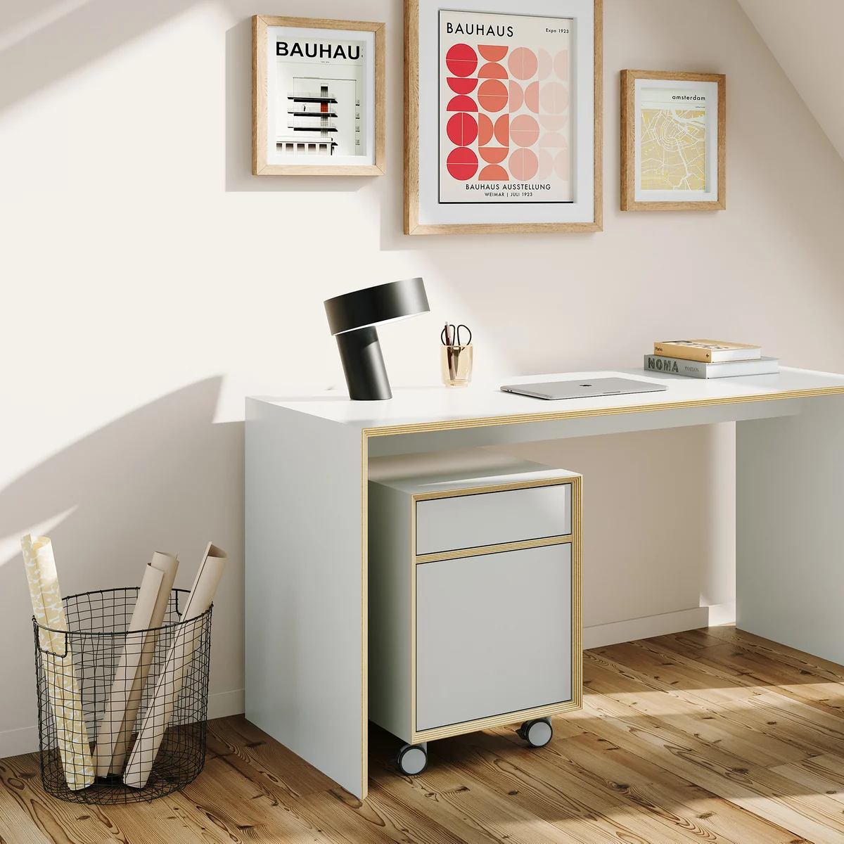 Der Bridge Container auf Rollen vereint hochwertiges Design und Funktionalität und ist ideal für Büro- oder Homeoffice-Lösungen. Dank zwei feststellbaren Rollen lässt sich der Container flexibel positionieren und sicher fixieren. Er bietet einen oberen Schubkasten mit push-to-open und slow-motion Funktion sowie eine Tür mit push-to-open, die zu einem Innenraum mit Einlegeboden führt. Die auf Gehrung verleimte Konstruktion aus 18 mm Birkenschichtholz mit CPL- oder HPL-Beschichtung garantiert Stabilität und Langlebigkeit. Die Möglichkeit, den Container mit einer Schreibtischablage zu kombinieren, macht ihn besonders praktisch.