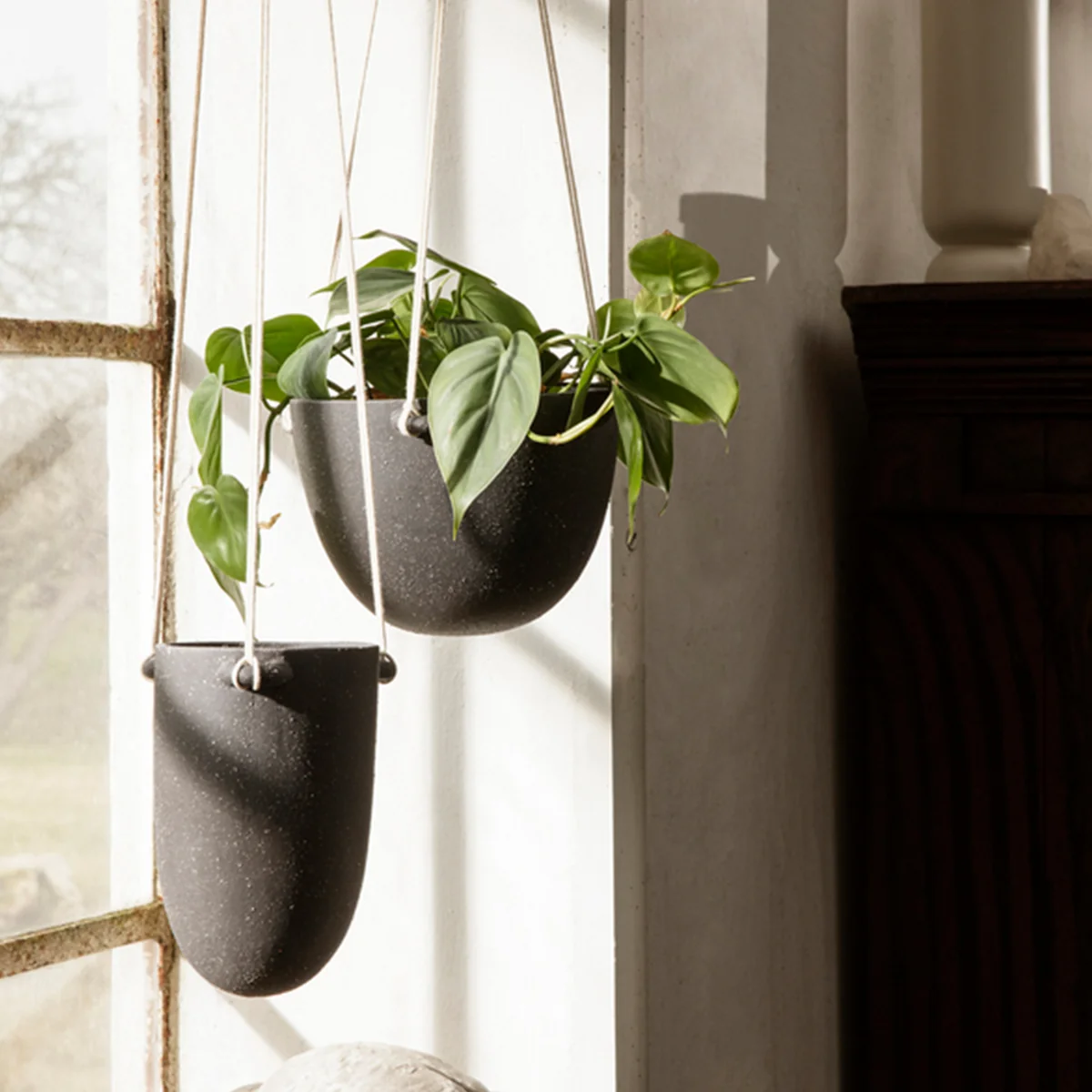 Der Speckle Hänge-Blumentopf von Ferm Living verfügt über eine körnige Struktur und bietet ein organisches, handgefertigtes Erscheinungsbild und Flair. Das Design-Objekt hat eine fließende, halbrunde Silhouette und wird mit einem verdrillten Baumwollseil aufgehängt. Dank der großzügigen Länge des Seils kann die Höhe einfach an die gewünschte Stelle im Haus angepasst werden.