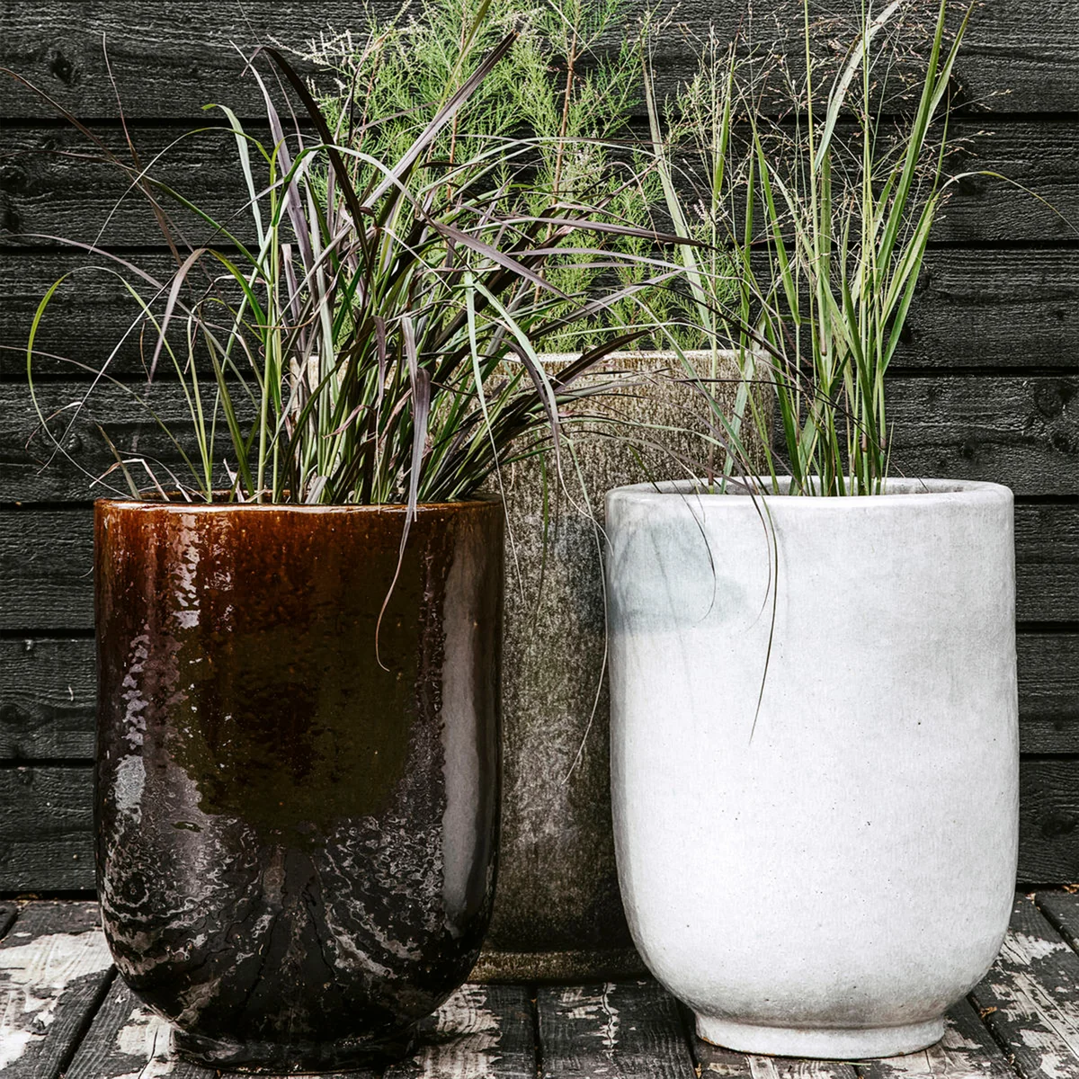 Die Töpfe sind aus Keramik gefertigt und wurden mit einer einzigartigen dekorativen Glasur versehen, die jeden Topf zum Unikat macht. Die Töpfe können mit Pflanzen in Szene gesetzt werden, die nach Wunsch an den Einrichtungsstil angepasst werden können und der Terrasse somit eine besondere Persönlichkeit verleihen. Die Blumentöpfe haben ein Loch im Boden und sind frostsicher bis zu -20 Grad.