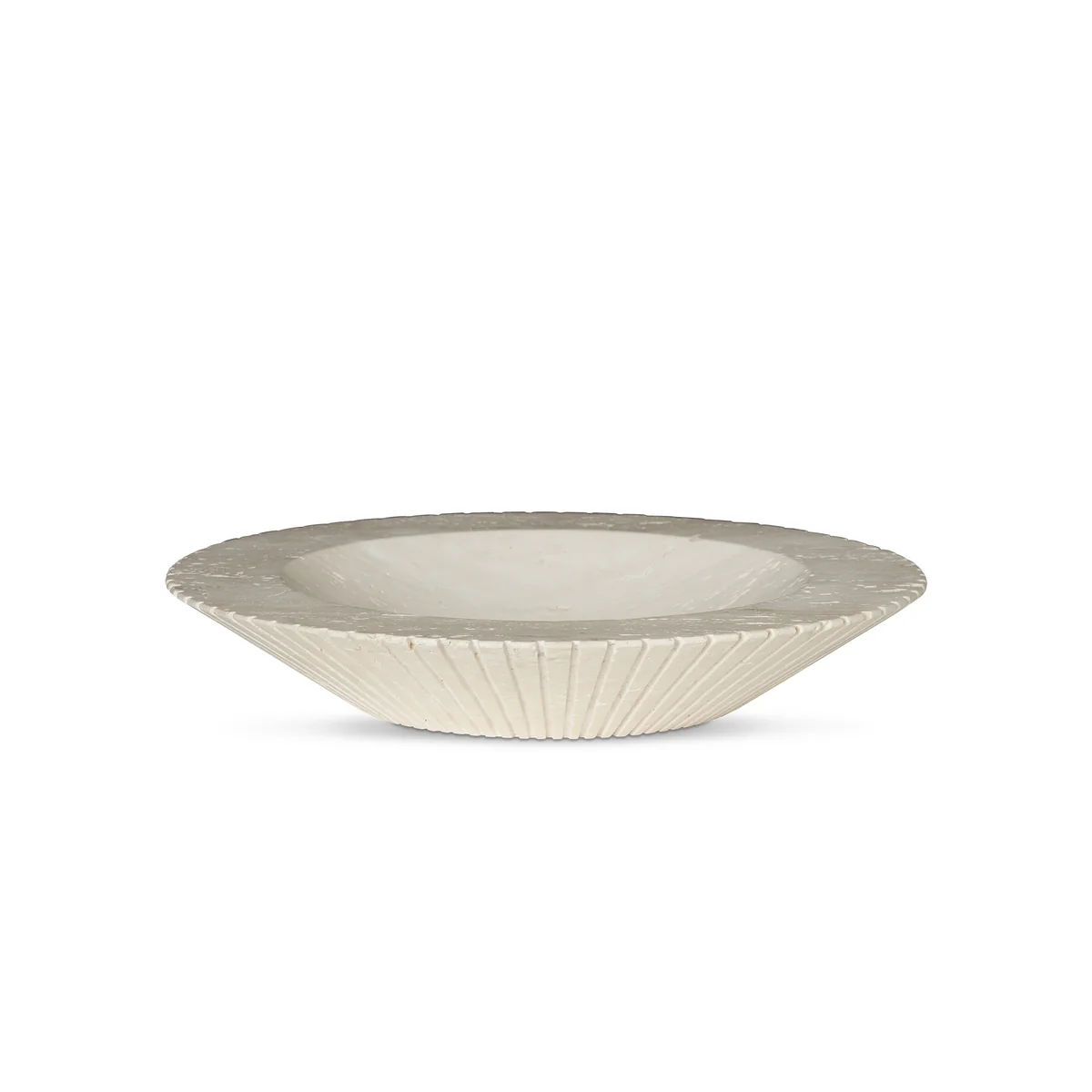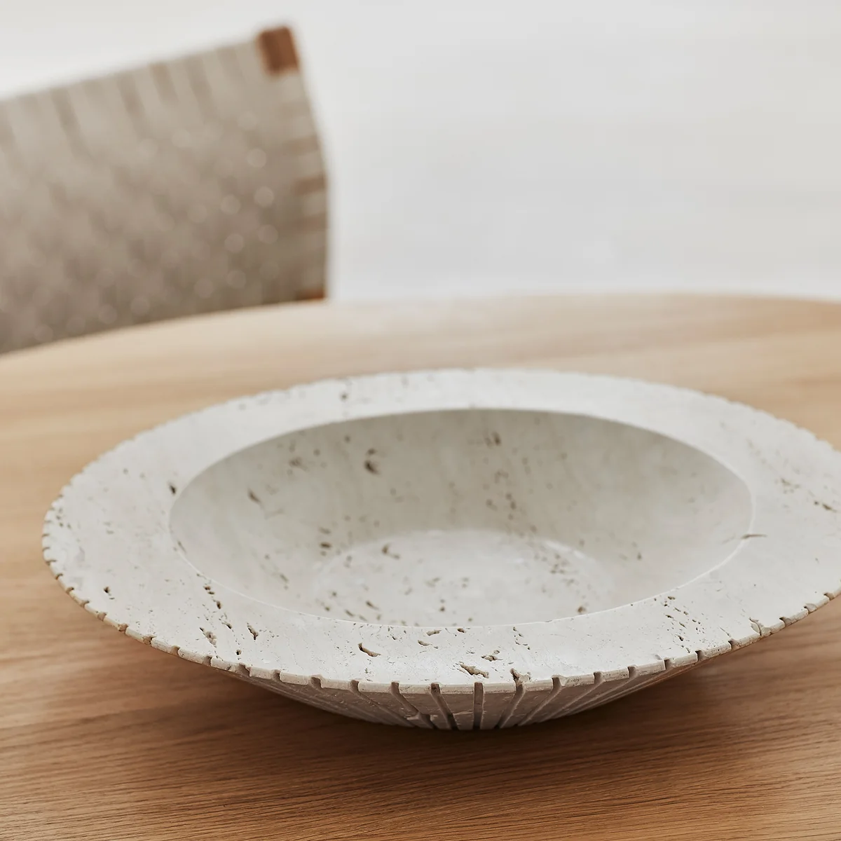 Die Locus Schale von Fredericia stellt eine moderne Interpretation von traditionellen Steinmetztechniken dar. Sie begeistert mit ihren eleganten Proportionen und seiner außergewöhnlichen Rillenstruktur um den äußeren Rand herum. Aus überaus hochwertigem Travertin gefertigt, verfolgt die Designerin Sofie Østerby das Ziel Materialpräsenz und Form in Einklang zu bringen.