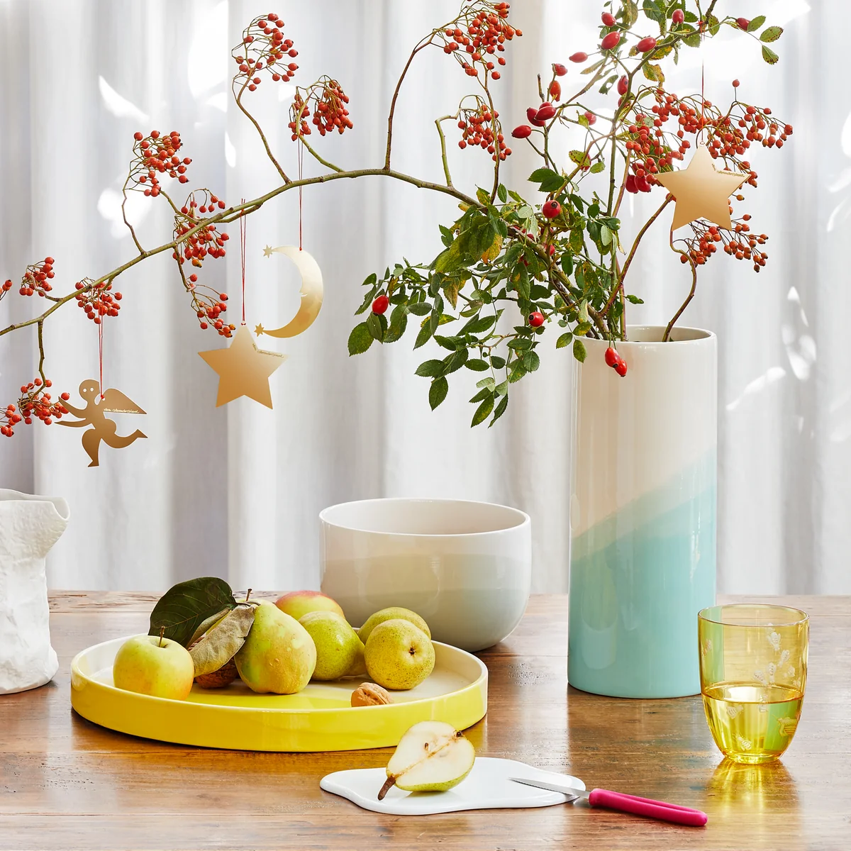 Nutzen lässt sich die Schale zu dekorativen Zwecken sowie zum Servieren von Snacks, Müsli und anderen Speisen. Neben der Schale ist auch eine Vase sowie ein Tablett in gleichem Stil erhältlich.