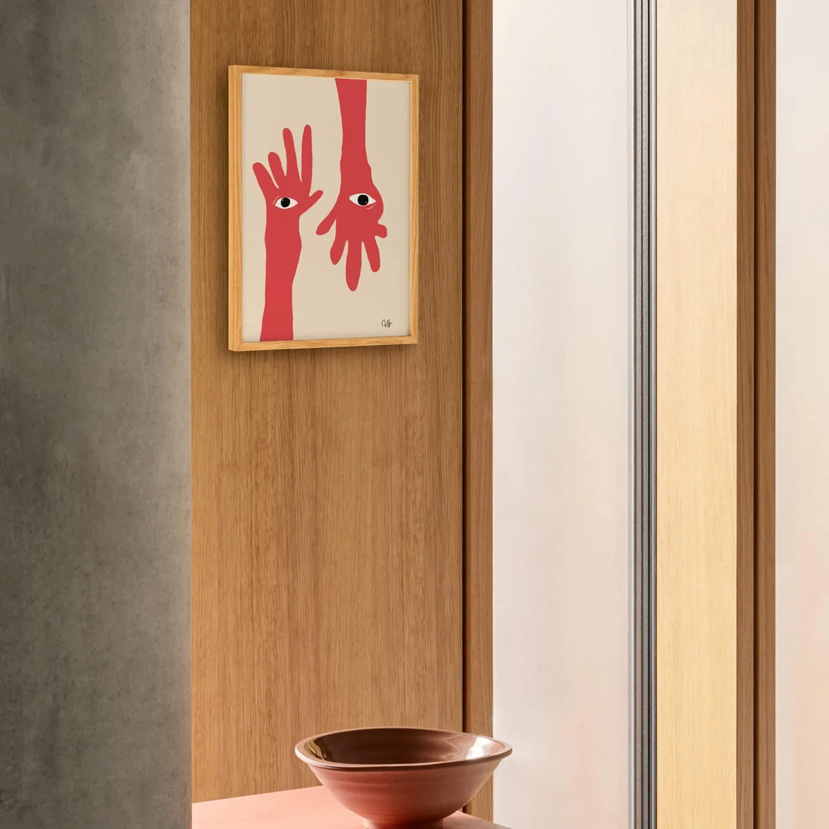 Das Hamsa Hands Poster von Paper Collective spielt mit dem Abstrakten und dem Spirituellen, wobei zwei rote Hände oben und unten am Bild baumeln. In der Mitte treffen sich zwei Augen, die sich verbinden, um aus zwei getrennten Welten ein Gesicht zu erschaffen.