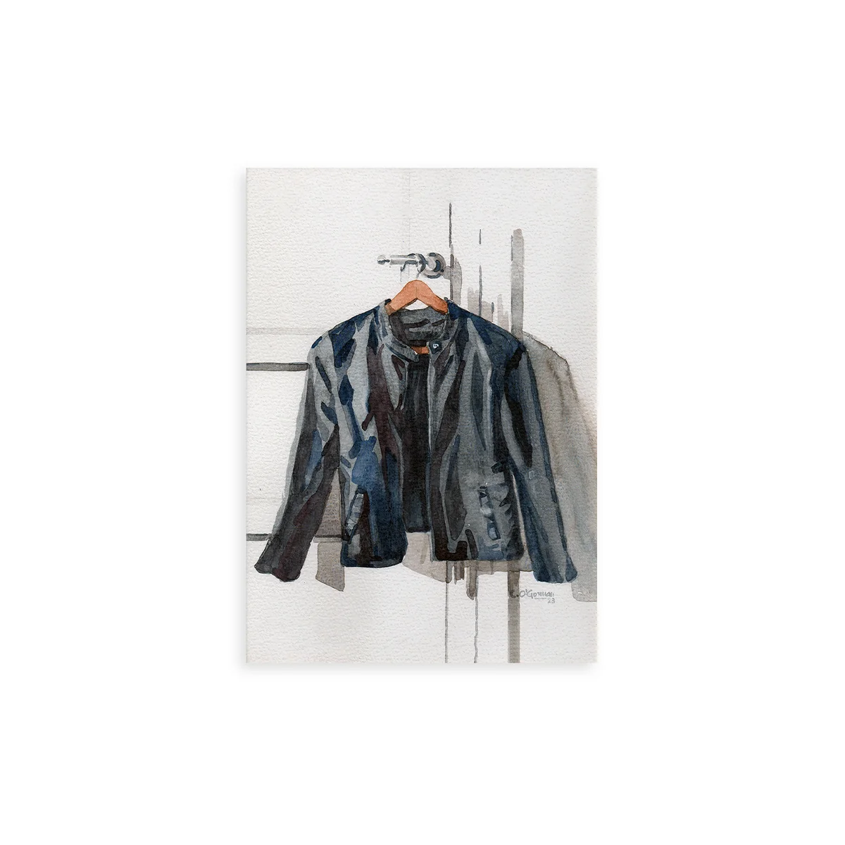 Das The Jacket Poster von Camila O'Gorman für Paper Collective nimmt einen Ehrenplatz ein und wirft ein Licht auf die Objekte in unserem Leben, die ein wenig mehr Aufmerksamkeit benötigen. Schichten von Aquarellfarbe sorgen für eine weiche, aber dennoch sehr detaillierte Komposition, während Licht und Schatten mit der Lederjacke spielen.