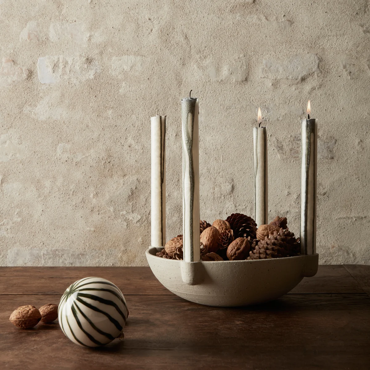 Der Bowl Keramik Kerzenständer des dänischen Herstellers Ferm Living ist dekorativ und multifunktional in einem. Mit einem Set angezündeter Kerzen verleiht der Kerzenständer dem Esszimmer oder Wohnzimmer einen einfachen und zugleich eleganten Look. In der Mitte der Schale können dekorative Lieblingsgegenstände aufbewahrt werden.