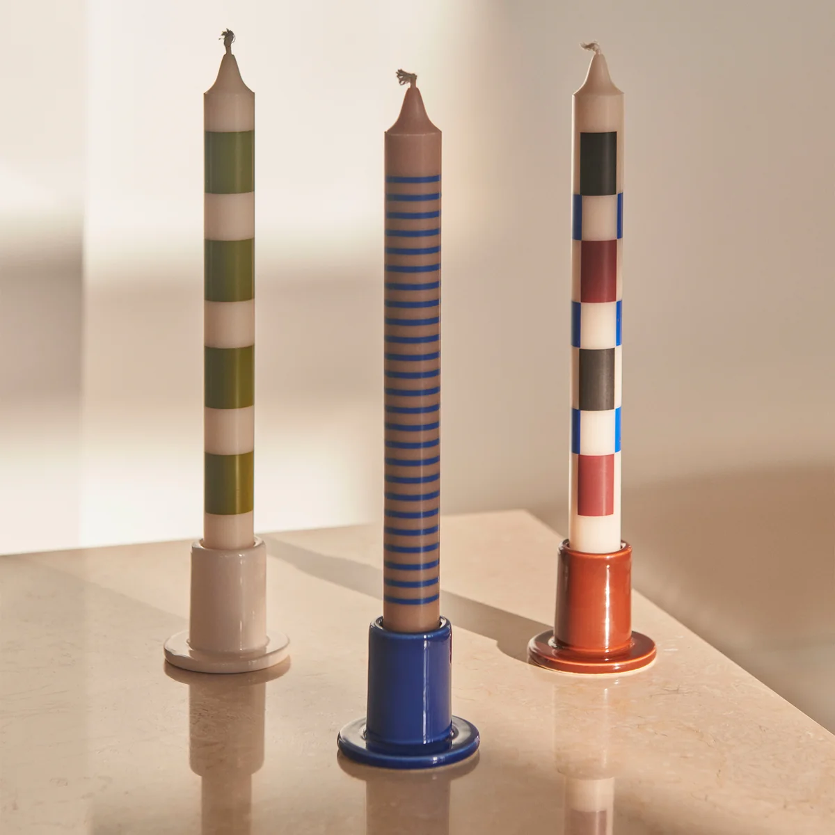 Der Tube Kerzenhalter von HAY im minimalistischen Rohrdesign ist aus Steingut gefertigt und ist in verschiedenen Ausführungen erhältlich. Er ist angepasst an die HAY Kerzen und kann sowohl einzeln, als auch in variativen Zusammensetzungen in allen Räumlichkeiten aufgestellt werden. Ob in der Küche, im Bad oder im Schlaf- und Wohnzimmer: Die Tube Kerzenhalter sind das kleine farbliche Detail, das jedes Regal, jede Kommode und jede Fensterbank aufwertet. Die kreisförmige Platte fängt Wachstropfen auf und verhindert somit, dass der Wachs auf das Mobiliar tropft.