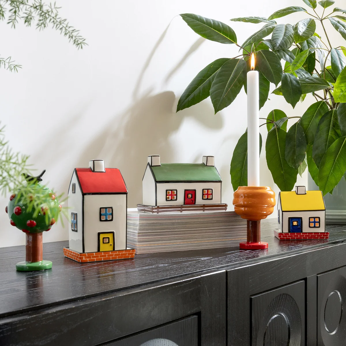 Der Haines Teelichthalter wurde in Zusammenarbeit mit dem englischen Keramiker und Illustrator Hal Haines entworfen. Die baumförmige Silhouette, handbemalt in lebendigen Farben, verbindet funktionales Design mit erzählerischer Gestaltung. Der Kerzenhalter eignet sich für Stabkerzen und Teelichter gleichermaßen und bringt eine verspielte, farbenfrohe Atmosphäre in jeden Raum. Ideal kombinierbar mit dem Teelichthaus von Hal Haines – für ein individuelles Miniaturdorf voller Licht und Fantasie.