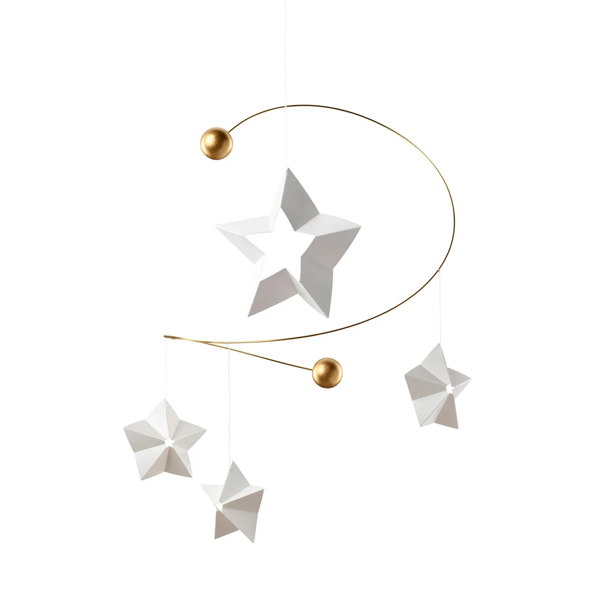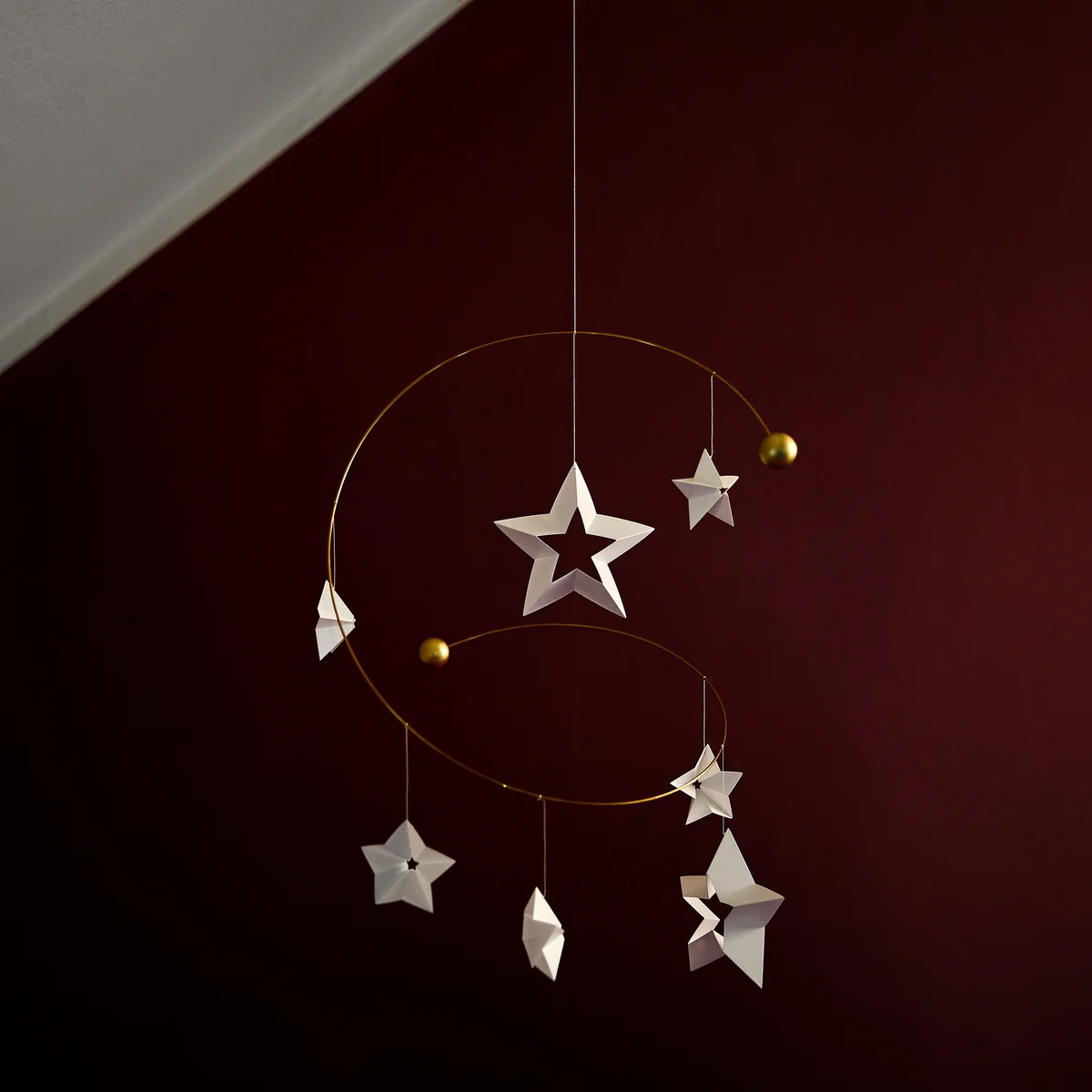 Herzstück des Mobiles ist ein Bogen mit glänzendem Messing-Finish, an dem sich die Sterne sammeln.
