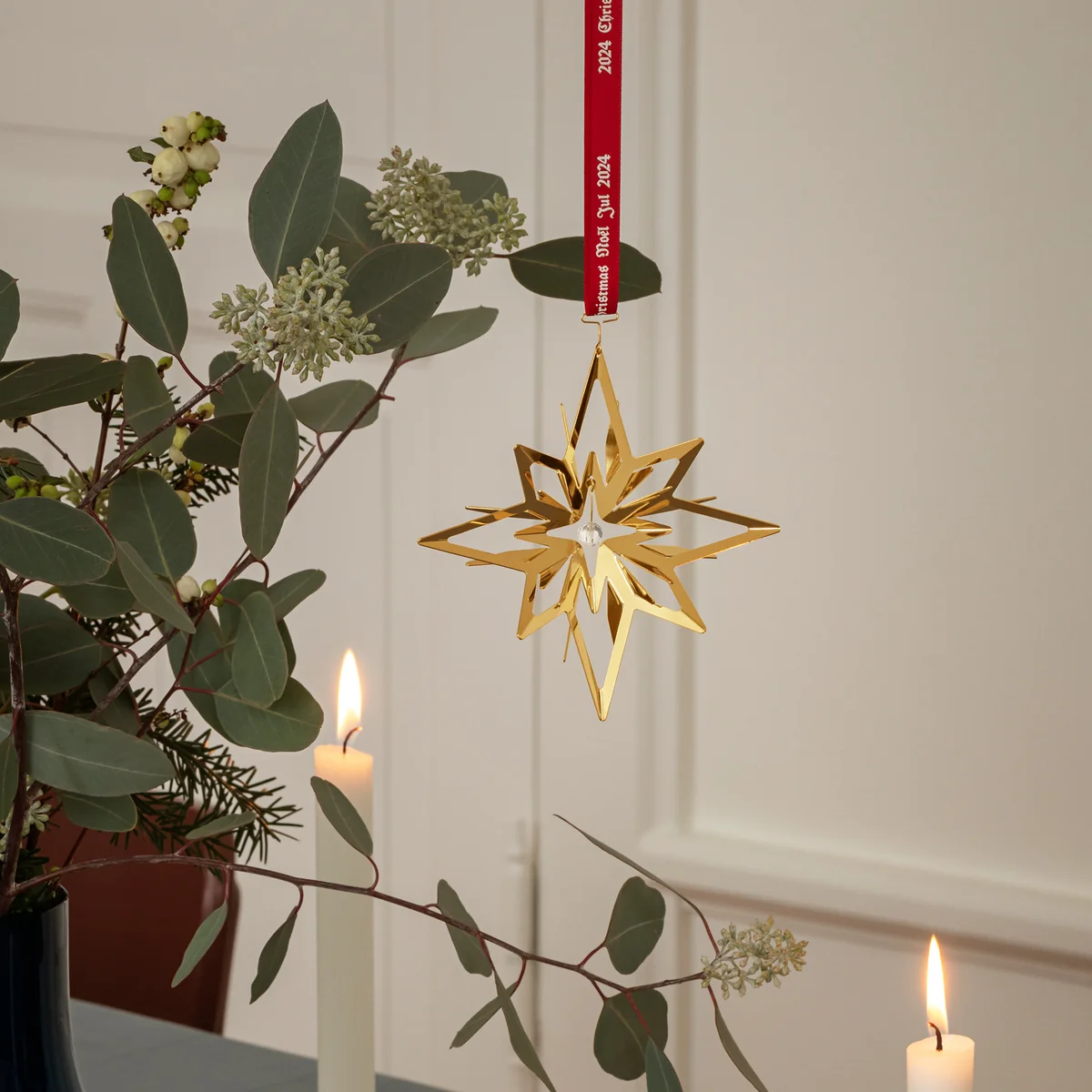 Das Mobile wird an einem stilvollen roten Band aufgehängt, das mit der Jahreszahl 2024 versehen ist, und zusätzlich mit einem blauen Band geliefert – ein elegantes Symbol für das Thema der diesjährigen Weihnachtskollektion. Der funkelnde Stern steht dabei für die zeitlose Schönheit des winterlichen Himmels.