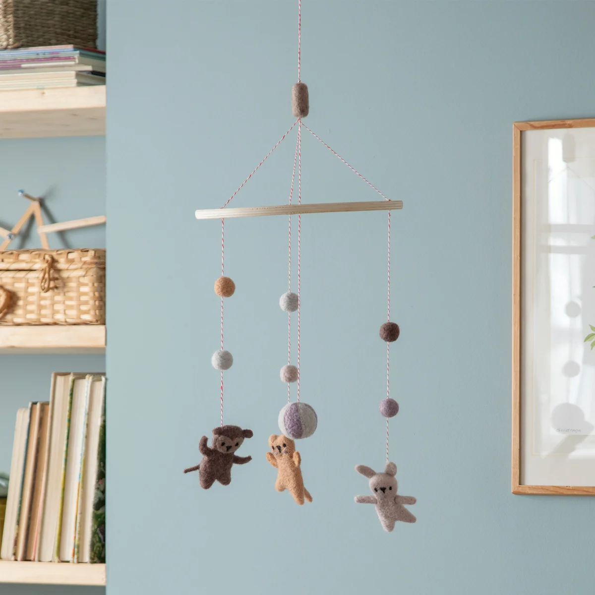 Das Filzmobile des dänischen Herstellers Sebra ist mit seinen niedlichen Figuren ein Must-Have in jedem Kinderzimmer. An einem Holzring sind hübsche Filzfiguren und kleine Kugeln befestigt, die teilweise leicht schief hängen, sodass das Kind die Figuren aus jeglichen Winkeln wunderbar betrachten kann.