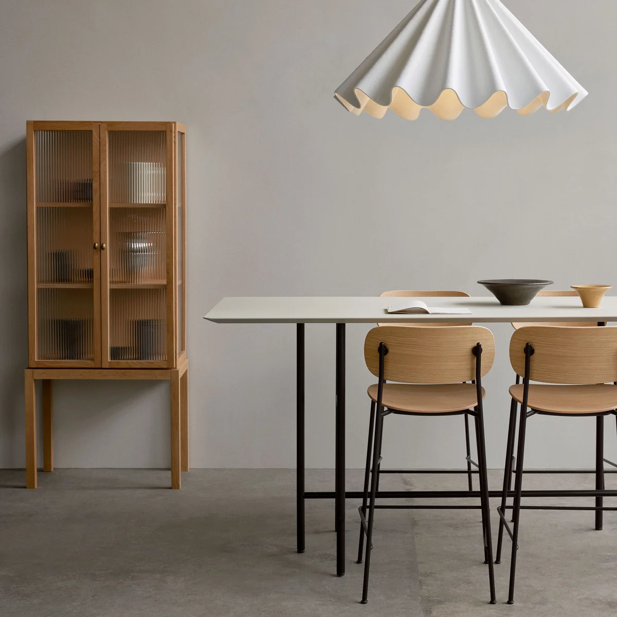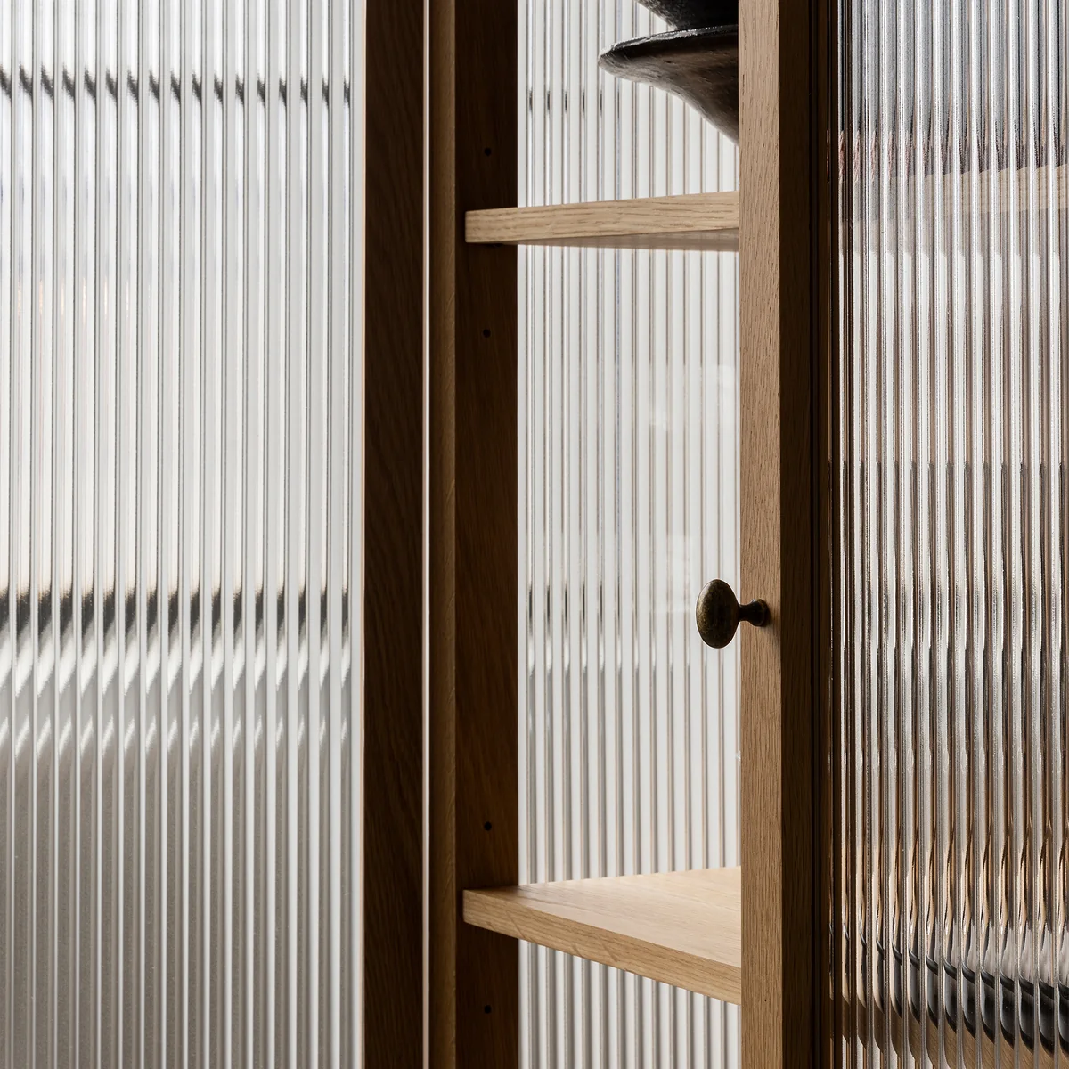 Die Curiosity Vitrine ist eine schöne und moderne Interpretation eines zeitlosen Möbelstücks. Die Vitrine ist aus massivem Eichenholz mit traditionellen Tischlertechniken gefertigt. Die eleganten, geriffelten Glastüren lassen die Inhalte der Vitrine optisch sanft verschwimmen. Im Innenbereich der Curiosity Vitrine befinden sich auf verschiedenen Höhen Regaleinsätze aus Eichenfurnier und bronzierte Messingbeschläge. Vom Alltagsgeschirr bis hin über zu Büroutensilien, sogar Kleidung kann in der Curisoity Vitrine aufbewahrt werden.