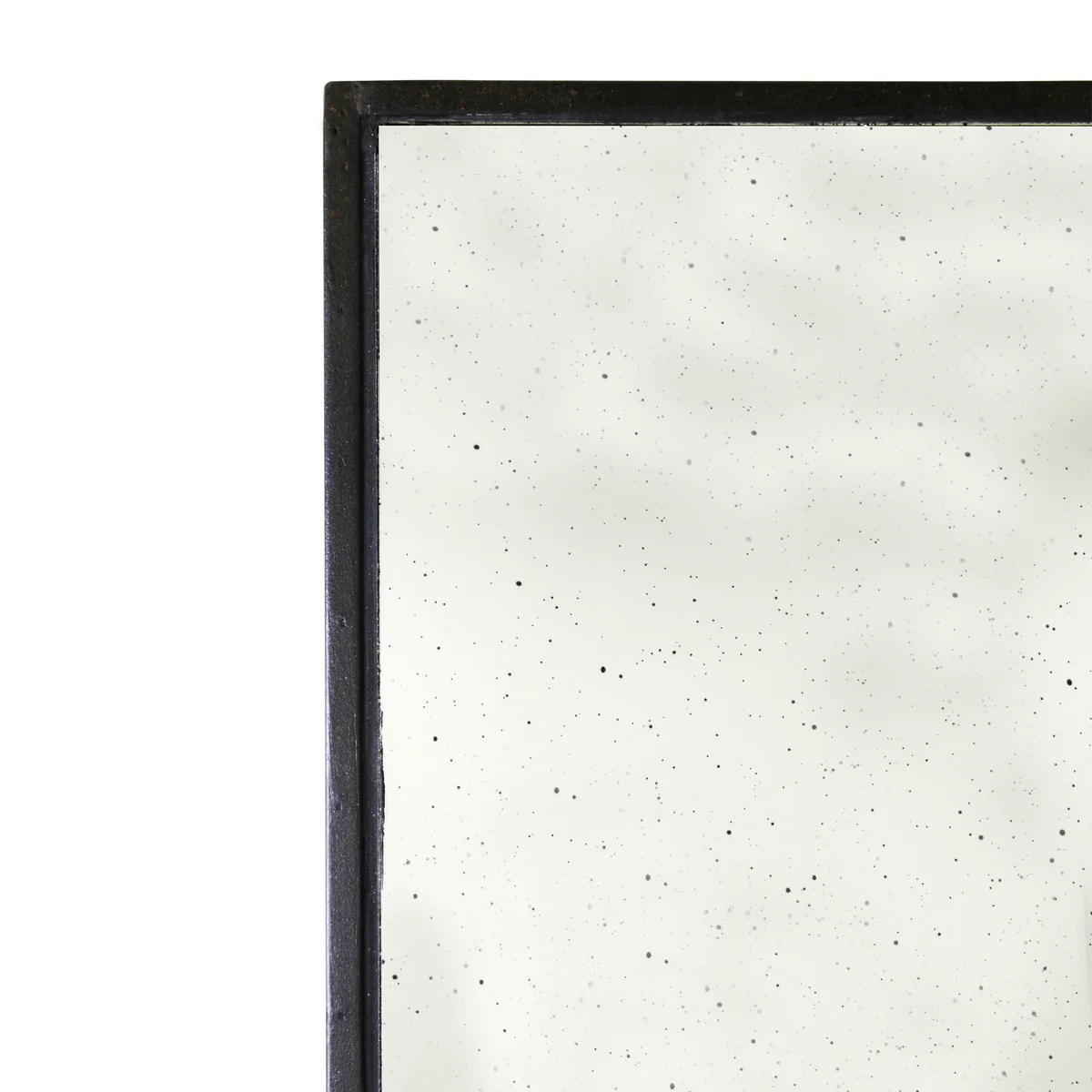 Der Rahmen des Spiegels besteht aus Holz und wurde mit einem Metall-Finish verschönert. Das Glas weist ein schwarzes Sprenkelmuster auf, was ebenfalls für einen metallischen Look sorgt. Intelligente Hängemechanismen sorgen dafür, dass der Spiegel sowohl horizontal als auch vertikal aufgehangen werden kann.