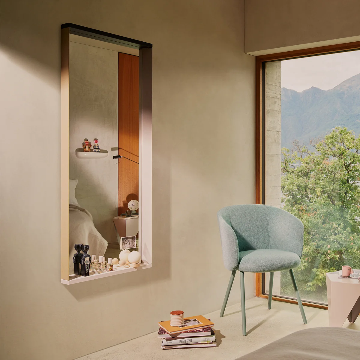 Mehrere Spiegel können an der Wand angeordnet werden – ähnlich wie Bauklötze – und sowohl vertikal als auch horizontal individuelle Arrangements bilden, deren Farben miteinander interagieren.