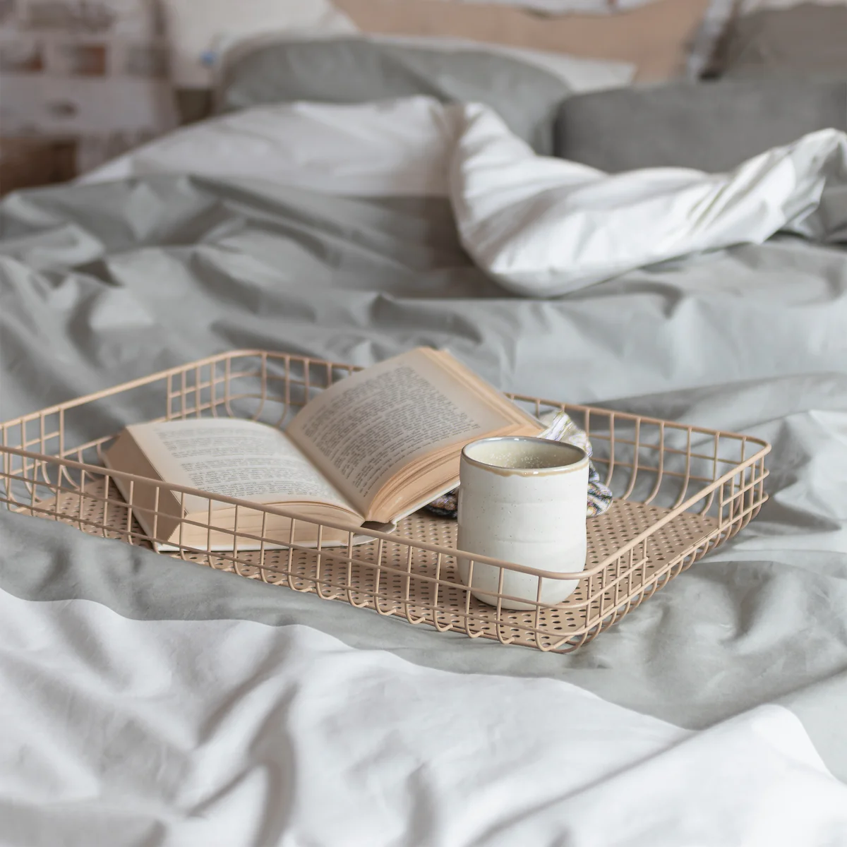 Das Lift Tablett von Mette Ditmer vereint Schlichtheit und Eleganz in einem Serviertablett, das sowohl dekorativ als auch praktisch ist. Das organische Design aus pulverbeschichtetem Metall sorgt für eine leichte und harmonische Optik. Die integrierten Griffe machen das Tablett ideal für ein Frühstück im Bett oder ein gemütliches Servieren auf der Terrasse.