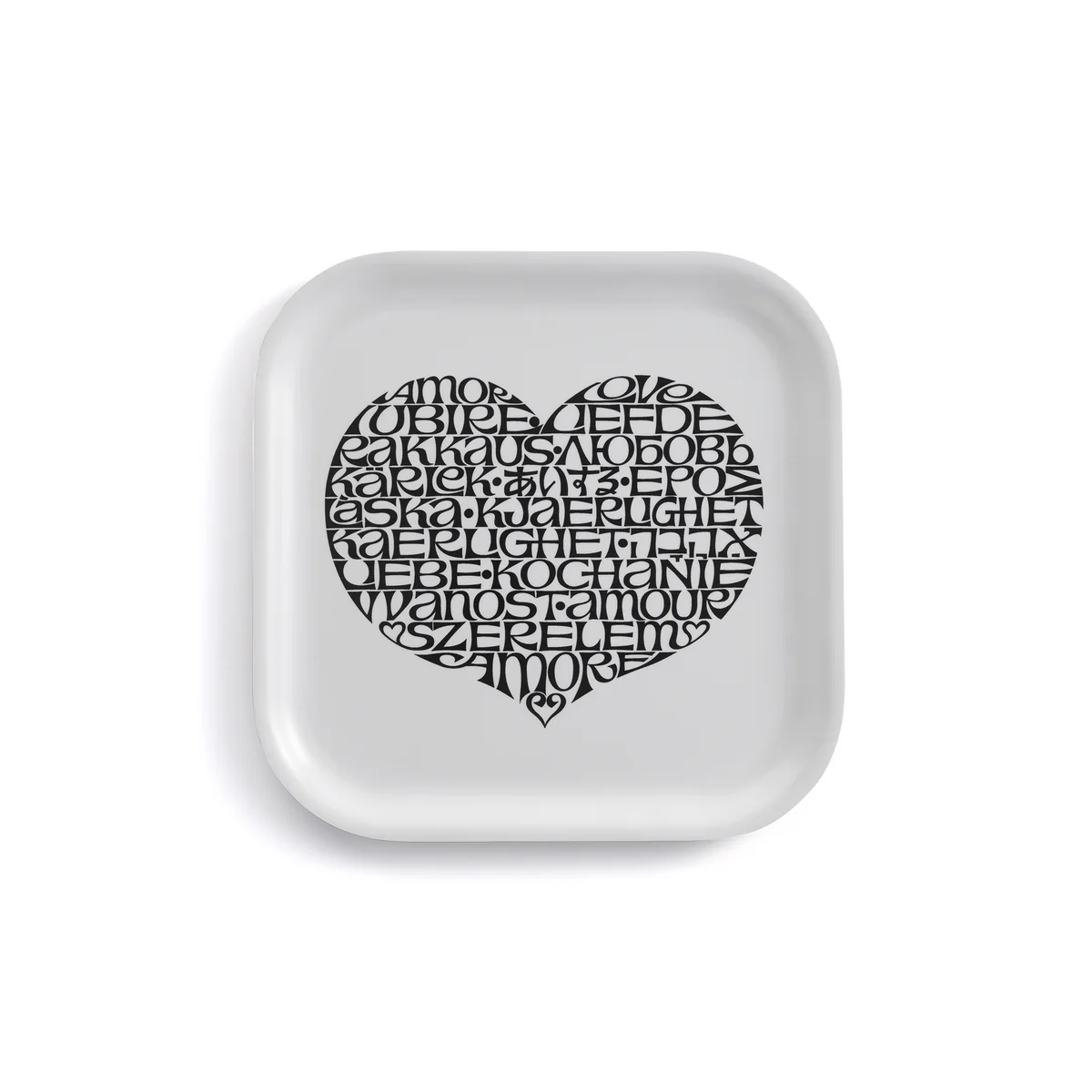 Das International Love Heart ist ein grafisches Herz von Alexander Girard in Schwarz und Weiß. In dem Herz steht das Wort Liebe in verschiedenen Sprachen. Das quadratische Tablett in den Maßen 28 x 28 cm macht sich toll in jedem Wohnbereich. Es kann zum Servieren von Kaffee und Tee benutzt werden oder als Dekoration auf dem Esstisch liegen. Hergestellt wird das Tablett aus laminiertem Schichtholz und sollte deshalb nur mit einem feuchten Tuch abgewischt werden.