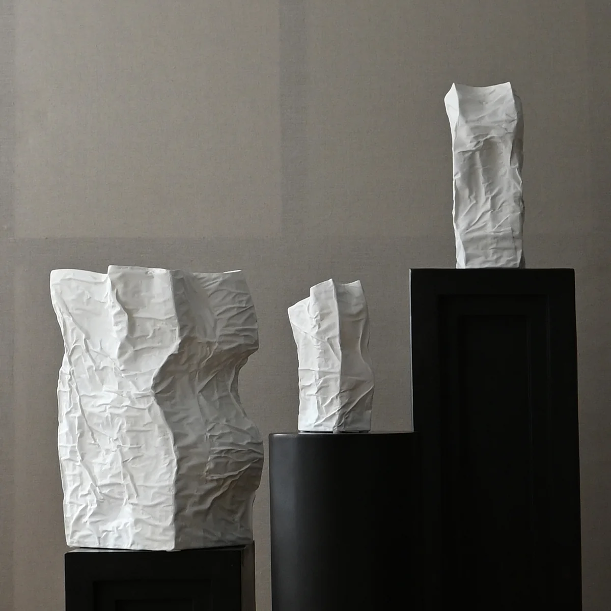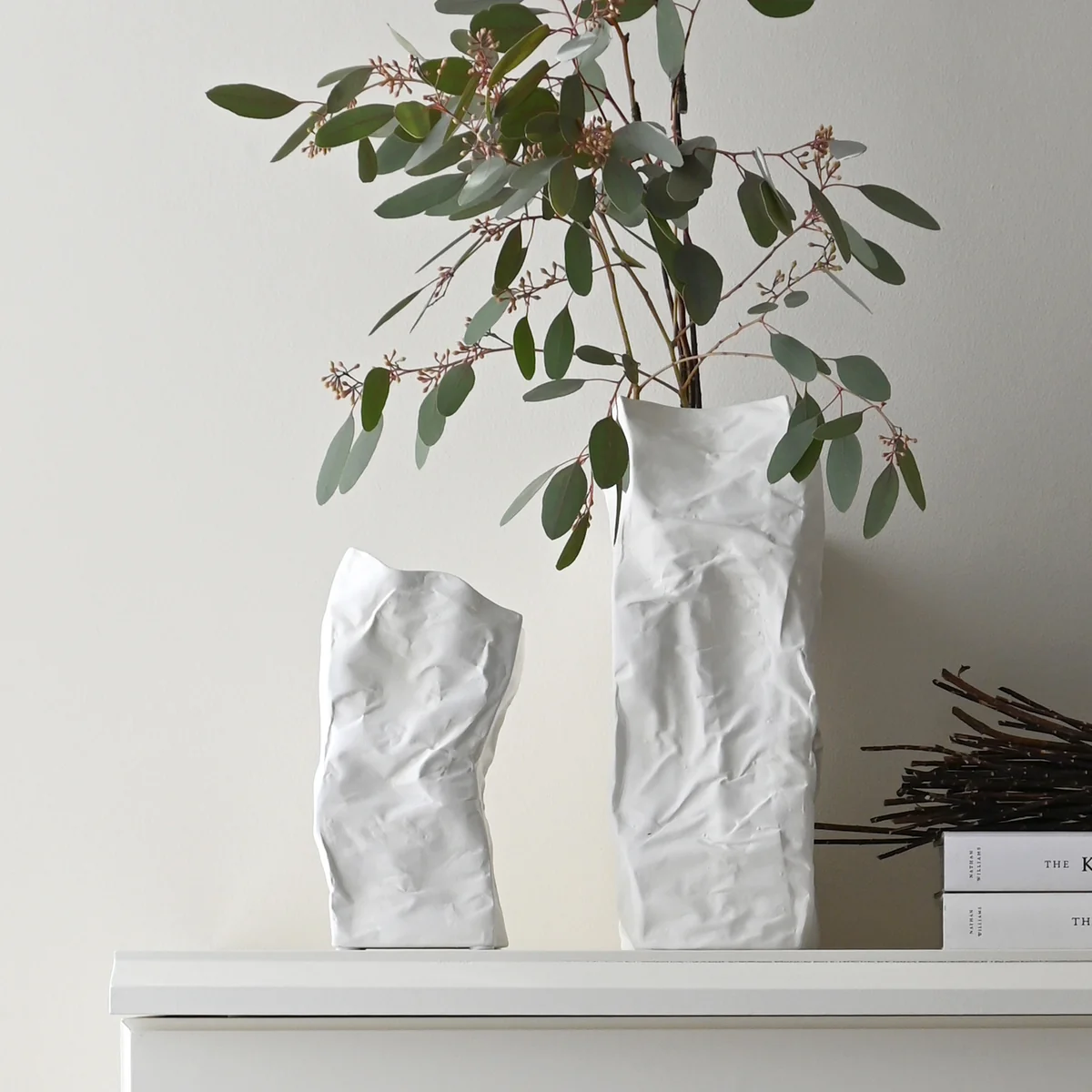 Inspiriert von Papiertüten, unterstreicht die Kami Vase von 101 Copenhagen die Schönheit von knittrigem und zerknittertem Papier. Benannt nach dem japanischen Wort für Papiertüten, ist Kami eine Hommage an die japanische Tradition der Papierkunst. Die Vase hat eine unebene Oberfläche mit Kurven und Rissen, die an eine zerknitterte Papiertüte mit knackigen weißen Rändern erinnert. Kami zeigt ein wunderschönes organisches Design mit einem handgefertigten Touch und ist in drei Größen erhältlich, hergestellt aus Keramik.