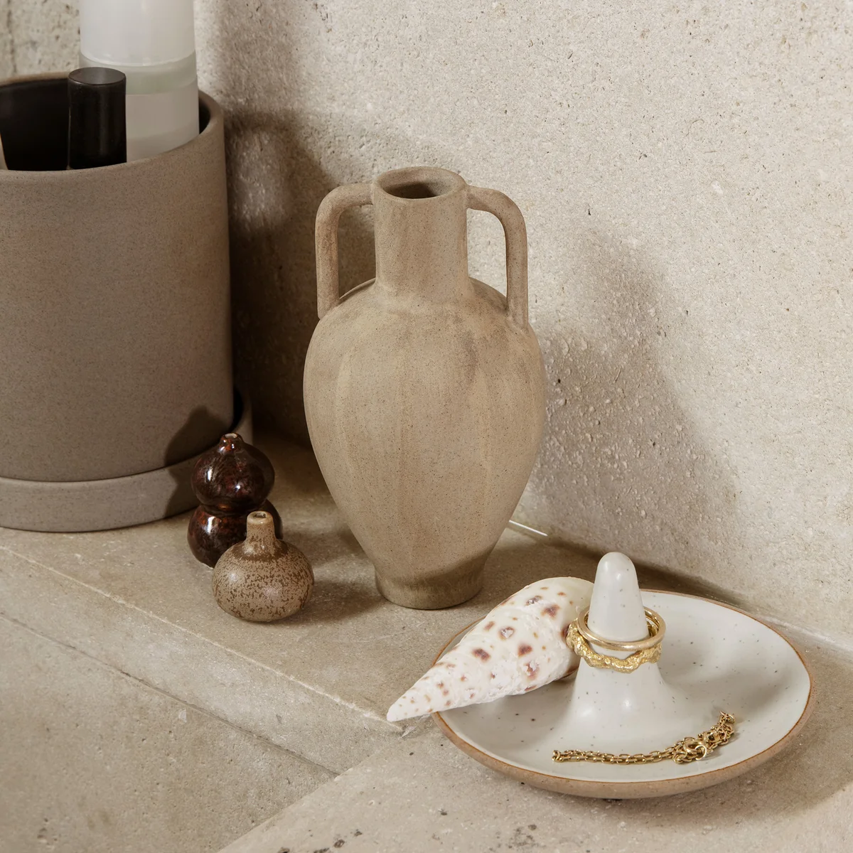 Die Komo Minivasen von Ferm Living, in dem praktischen 3er-Set, sind perfekt, um ein dekoratives Stillleben zu kreieren. Die kleinen, molligen Vasen präsentieren eine reaktive Glasur, die ihnen einen einzigartigen Ausdruck verleiht. Egal ob im Bücherregal, auf dem Tisch oder auf der Fensterbank - die Vasen können gemeinsam mit andere geschätzten Gegenständen auf einem Tablett mit Stängelblumen oder Räucherstäbchen kombiniert werden.