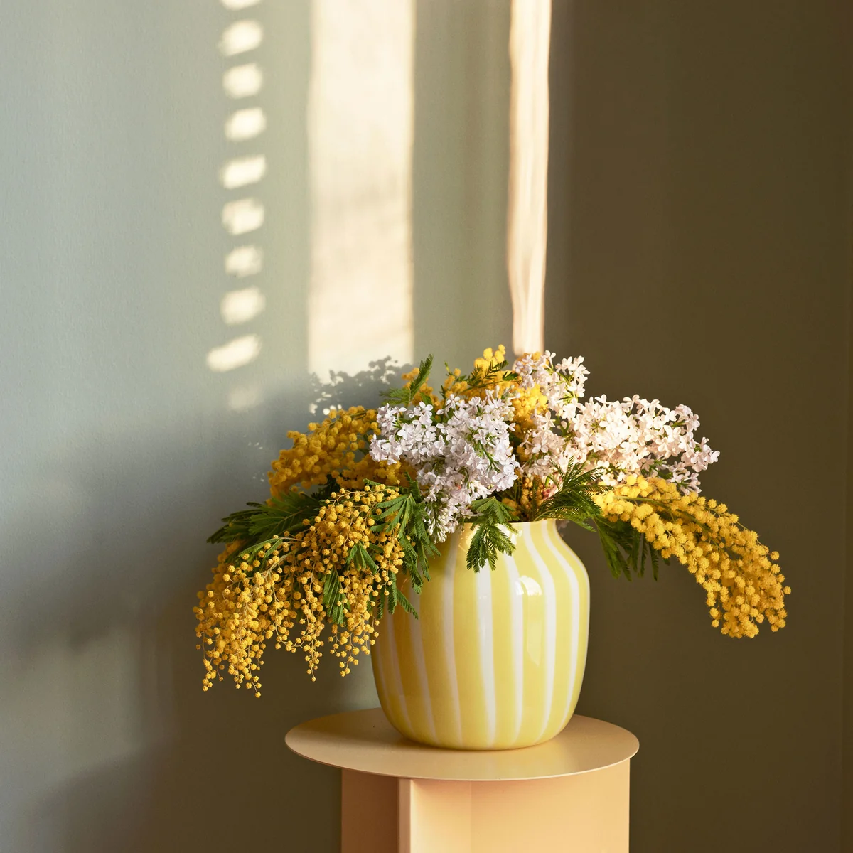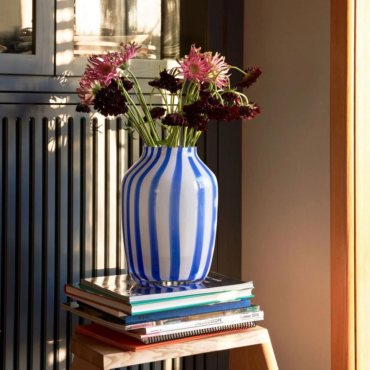 Die Juice Vase von HAY sorgen mit ihren frischen Farben und dem Streifenmuster für einen Hingucker. Sowohl mit als auch ohne Blumen machen sich die Vasen dekorativ auf dem Esstisch, dem Beistelltisch oder in der Fensterbank in jedem Raum. Vertikale, opake und klare Streifen erzeugen eine subtile Farbvarianz in Kristine Five Melværs Glasvasen-Serie.