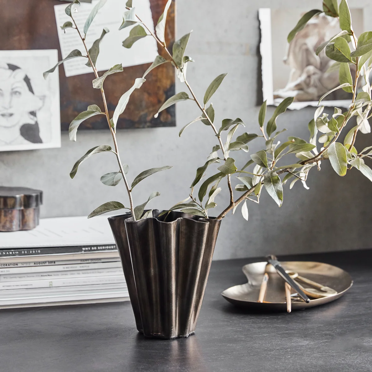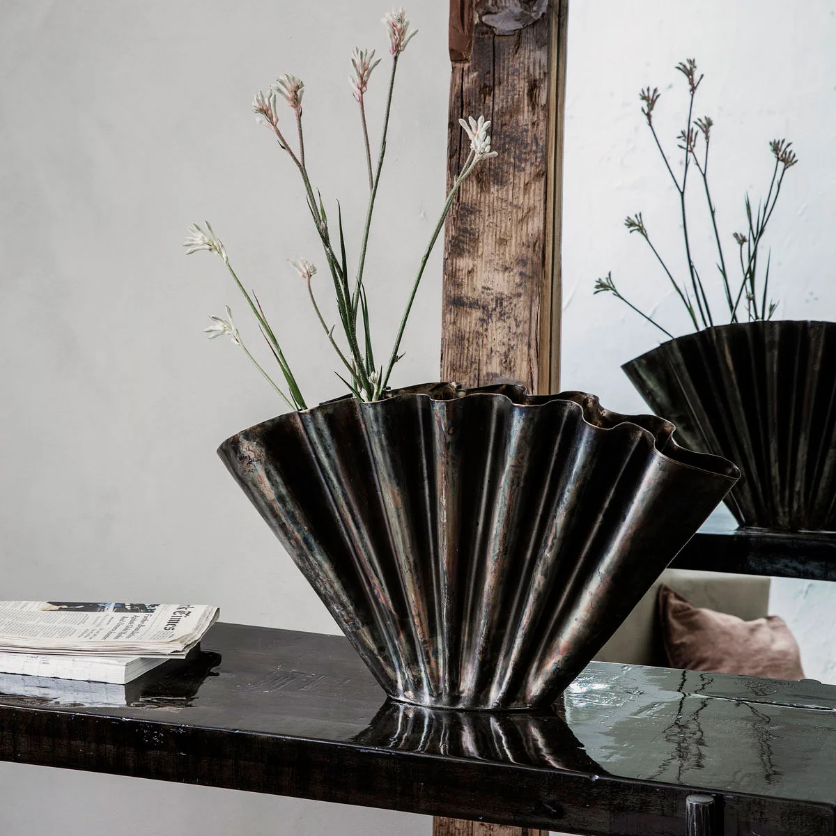 Die Flood Vase von House Doctor überzeugt durch ihre außergewöhnliche Form und das Material im industriellen Look. Die Vase erinnert in ihrer Form an eine Muschel und die Seiten winden sich in Wellenform. Aus Eisen hergestellt, bekommt die Vase ein raues und dekoratives Aussehen, wodurch sie zum Hingucker in jedem Wohnbereich wird.
