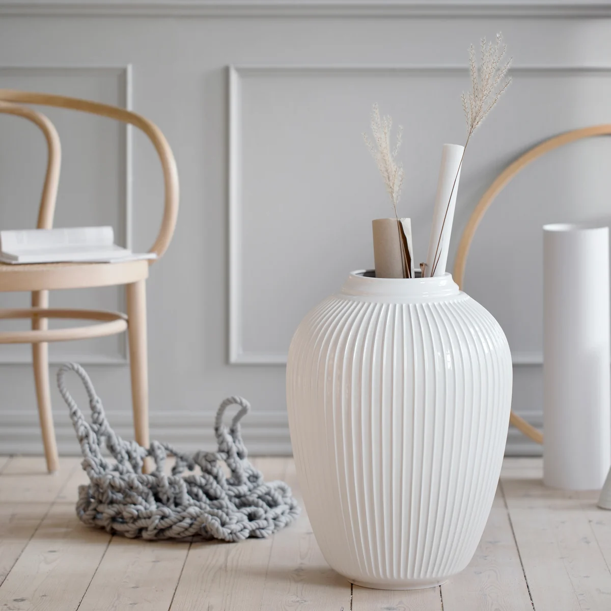 Das handgearbeitete Rillenmuster prägt die Tableware-Kollektion des Designers Hans-Christian Bauer für Kähler Design. Nach den ursprünglichen Entwürfen von Svend Hammershøi, wurde diese Serie aus zeitlosem und eleganten Geschirr, Vasen und Kerzenhaltern kreiert.