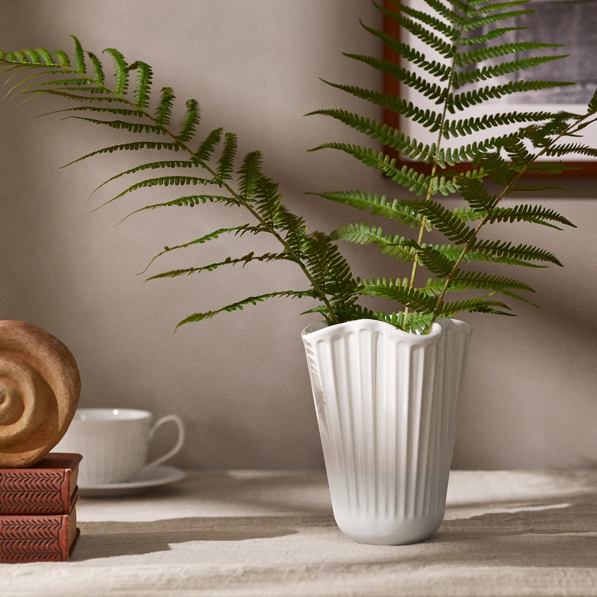 Gefertigt aus hochwertiger, kreideweißer Keramik, ist die Hammershøi Unfold Vase in zwei Größen erhältlich: 16,5 cm und 20,5 cm. In Kombination entstehen harmonische Arrangements für frische Blumen oder dekorative Zweige. Die Vase fügt sich stilvoll in verschiedene Wohnambiente ein und bringt eine nostalgische, zugleich zeitgemäße Note in jedes Zuhause.