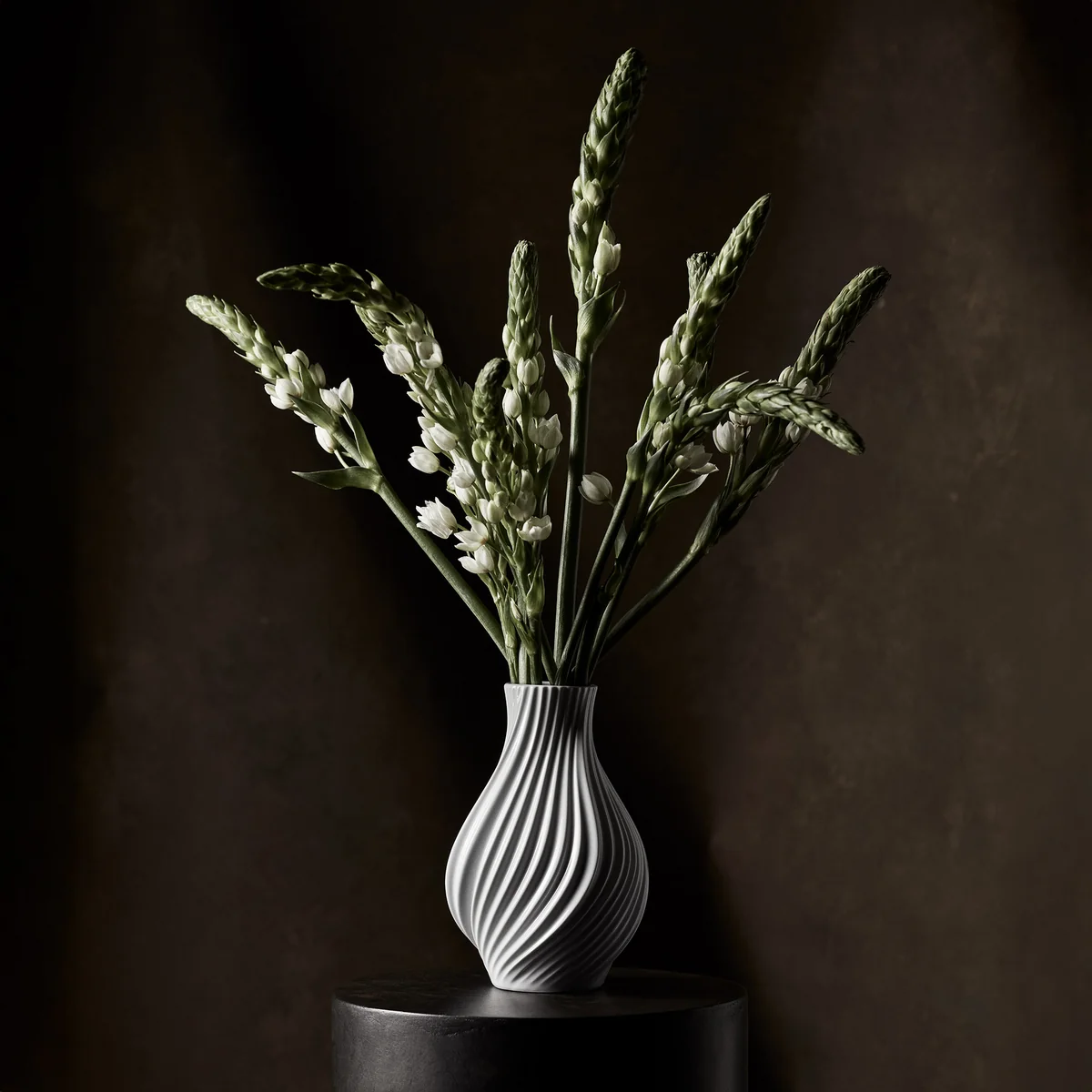 Die Twist Vase von Lyngby Porcelæn ist eine moderne Interpretation klassischer Vasenformen, inspiriert von natürlichen Strukturen wie Baumrinde, Blütenstängeln und Spiralgalaxien. Das skulpturale Design spielt mit der charakteristischen Linienführung der Lyngby-Serie und verleiht dem Porzellanobjekt eine ruhige, fließende Bewegung. Mit ihrer klaren Formgebung und eleganten Präsenz fügt sich die Vase harmonisch in moderne Wohnräume ein – einzeln als Statement-Piece oder in Kombination mit weiteren Größen der Serie (18, 25 und 31 cm).