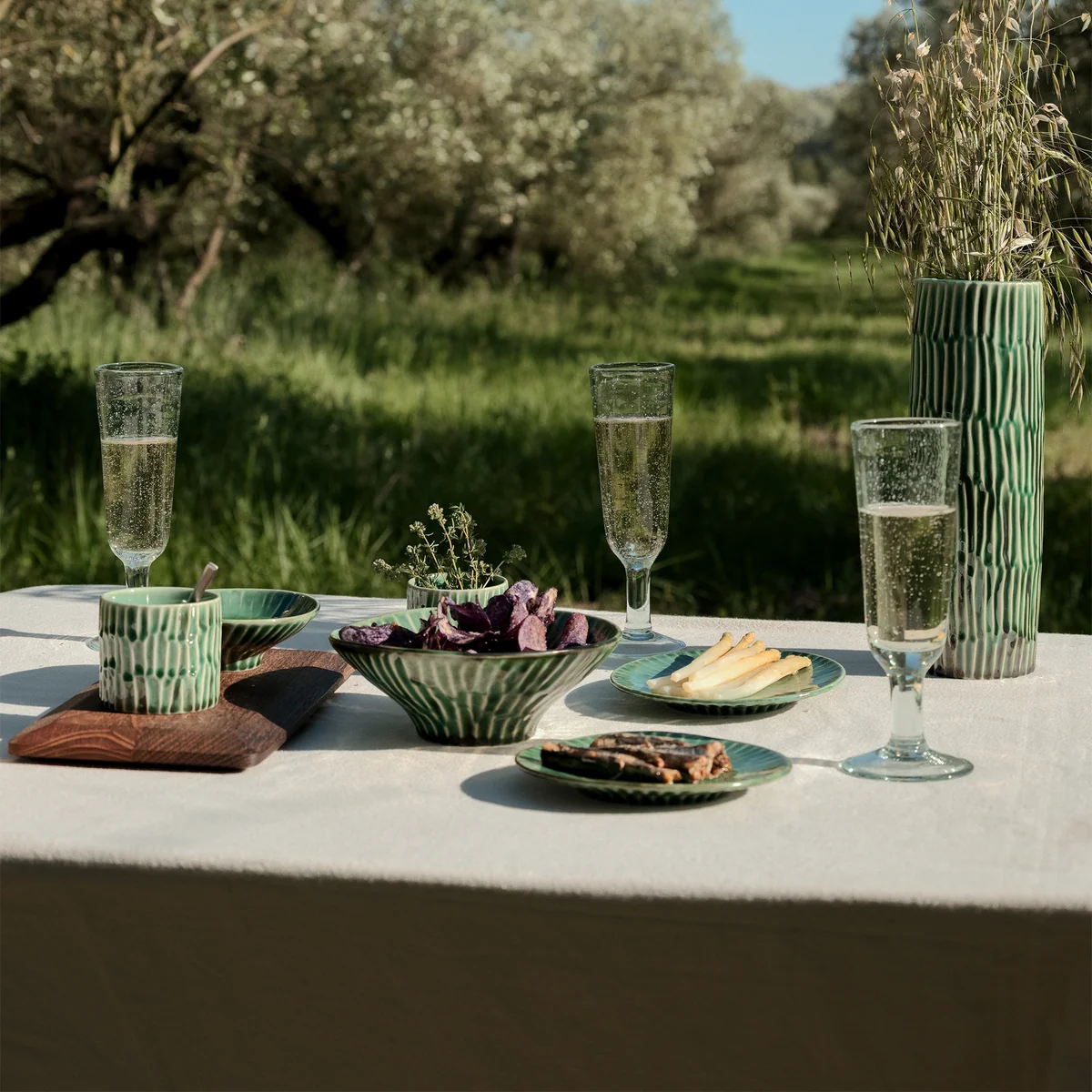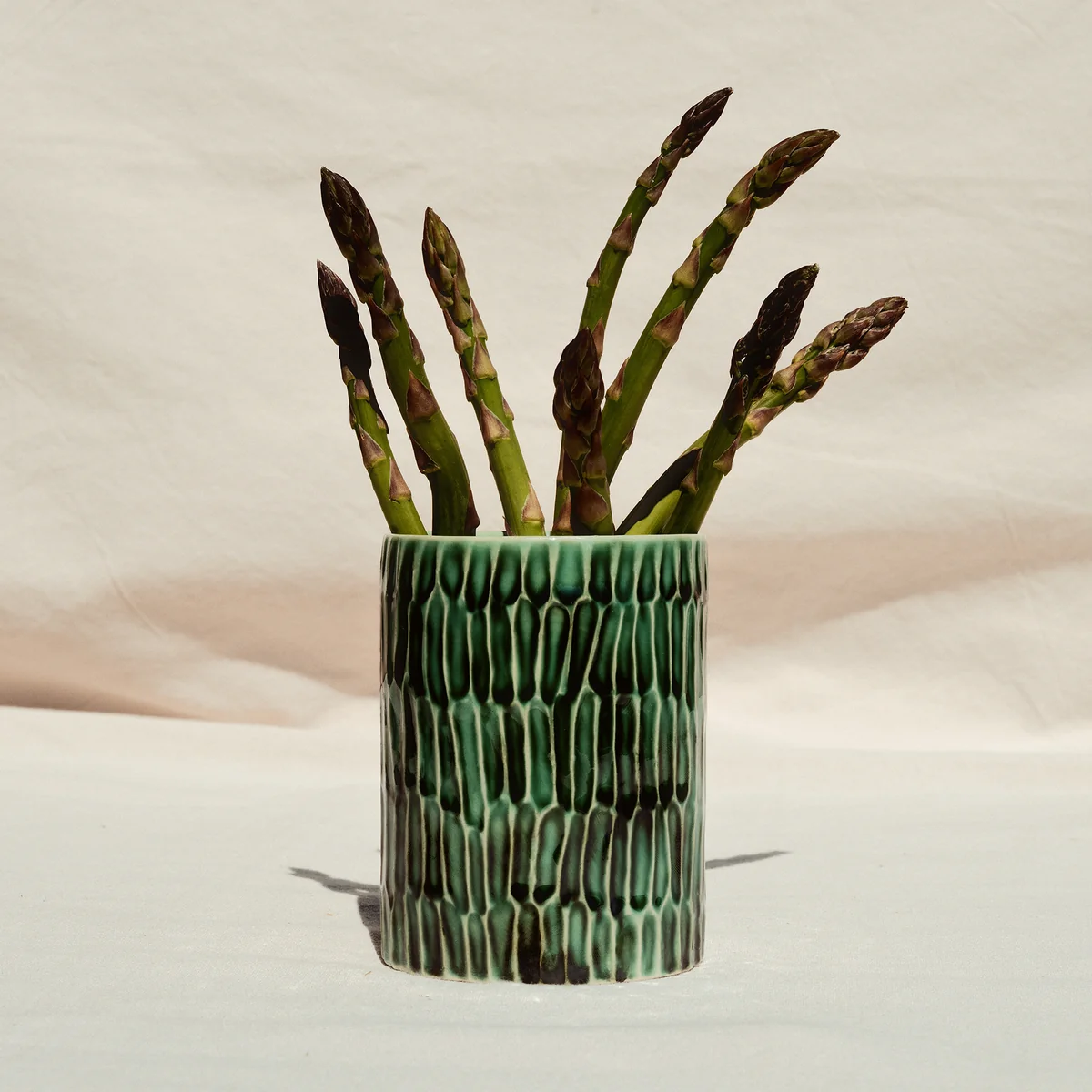 Die Verde Lanza Vase von Pascale Naessens für Serax verbindet Funktionalität mit einem ausdrucksstarken Design. Gefertigt aus Steingut, ist sie von den grünen Fenstern, Türen und der Vegetation auf Lanzarote inspiriert, wo die Designerin häufig lebt. Die sonnengebräunte Glasur in einem natürlichen Grünton wird durch eine muschelartige Textur veredelt, die Naessens selbst mit ihren Fingern eingeprägt hat. Ob für Kochutensilien, Besteck oder Blumen – die Vase ist ein vielseitiges Accessoire, das Küche und Essbereich auf stilvolle Weise bereichert.
