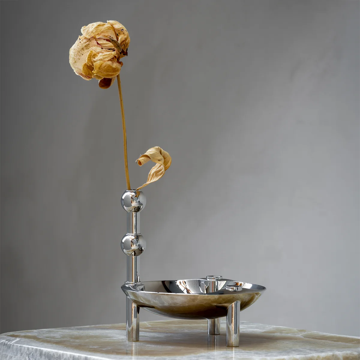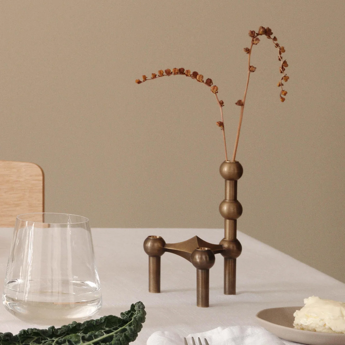 Das besondere Stück ist aus massivem Messing gefertigt und wird im Laufe der Zeit patinieren. Die Vase ist auch in Chrom oder schwarz erhältlich.