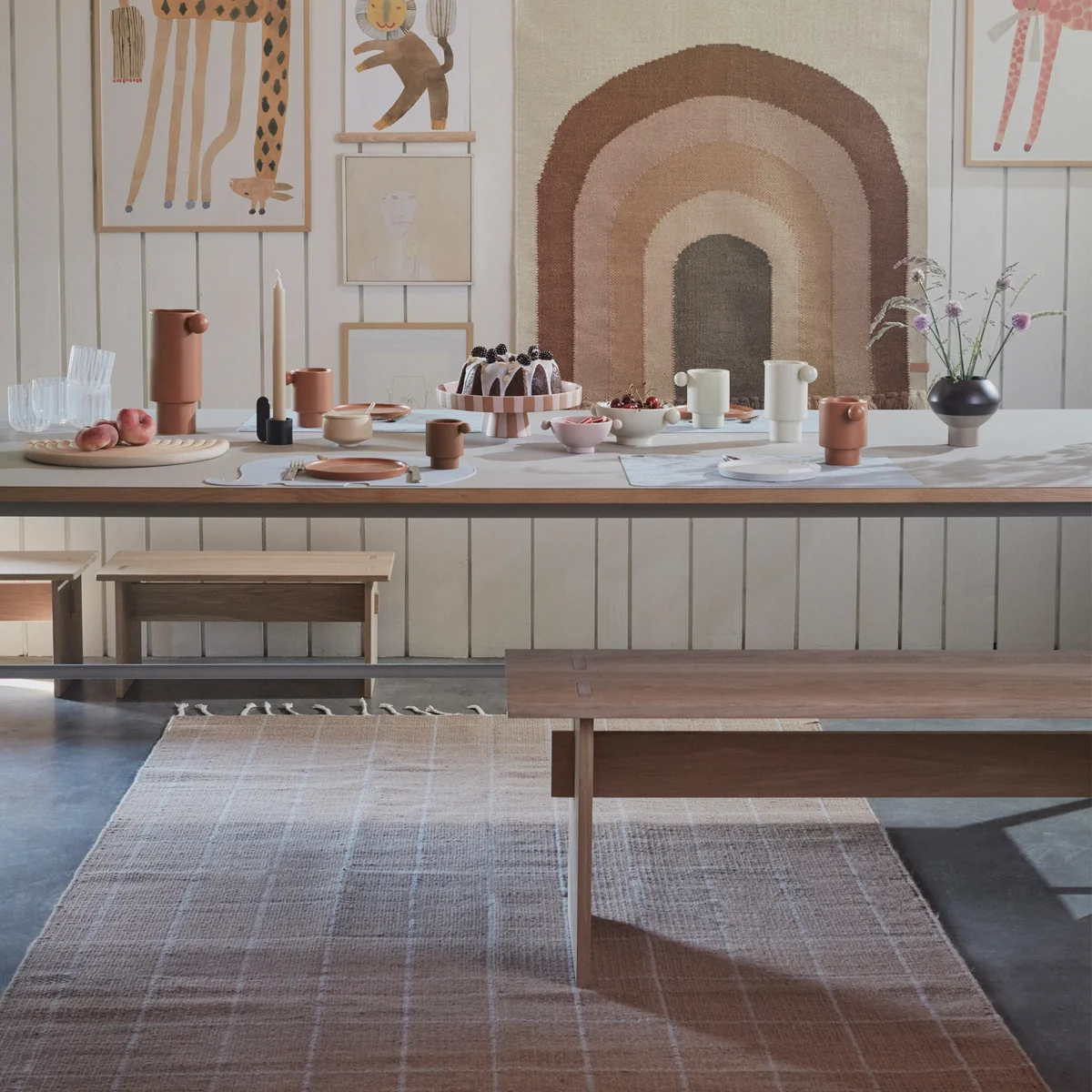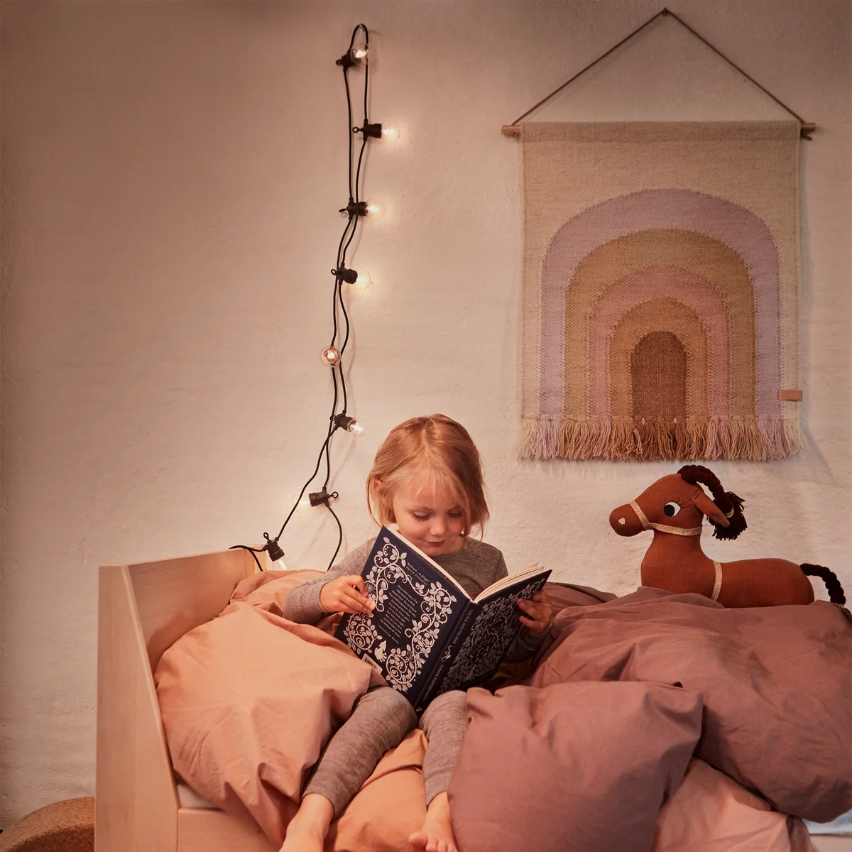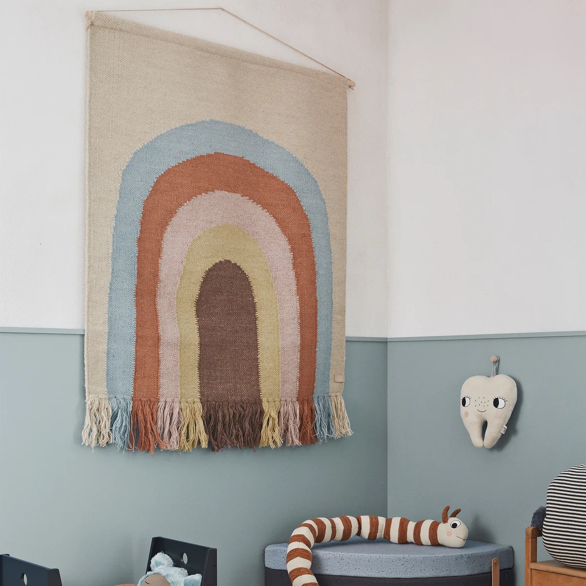 Der Follow the Rainbow Wandteppich von OYOY ist sowohl niedlich als auch verspielt. Der Teppich stellt einen mehrfarbigen Regenbogen dar und besteht aus 95 % Wolle und 5 % Baumwolle.